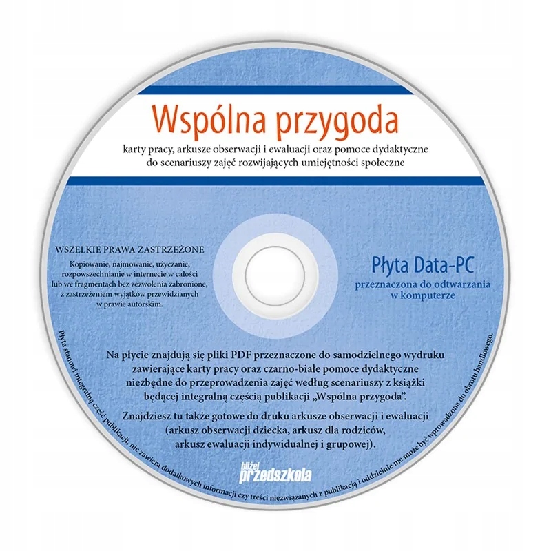 - płyta CD z kartami pracy, arkuszami obserwacji i ewaluacji oraz czarno-białymi pomocami dydaktycznymi przeznaczonymi do samodzielnego wydruku.