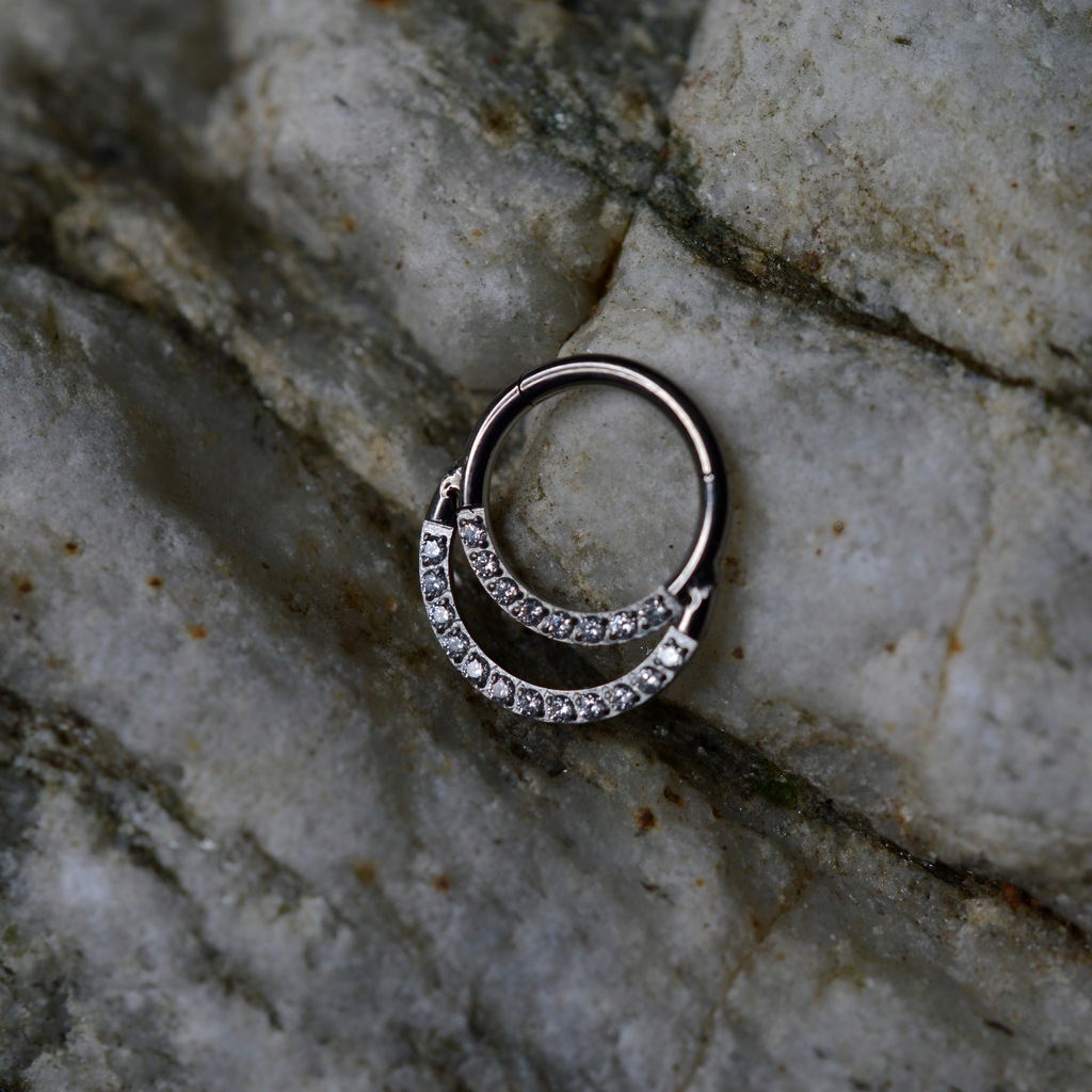 Tytanowy podwójny clicker z kamieniami to biżuteryjny dzieło sztuki, które emanuje nowoczesnym wdziękiem i subtelnym blaskiem drogocennych kamieni. To innowacyjna interpretacja klasycznego clickera, która łączy w sobie funkcjonalność, estetykę i głęboki znaczenie.
