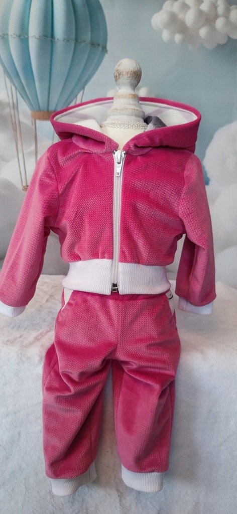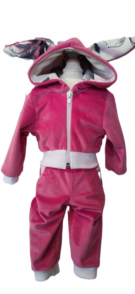 ✨Bluza z kapturem i spodnie z kieszeniami w kolorze różowym. Dres uszyty z velvetu (aksamitu), który posiada delikatną strukturę. Bluza posiada kaptur z uszami, wnętrze kaptura uszyte tkaniny bawełnianej (biała w różowe kwiaty). Bluza zapinana na zamek. Spodnie dresowe mają dwie kieszonki, w pasie wszyta gumka.