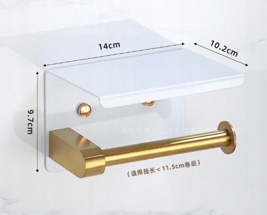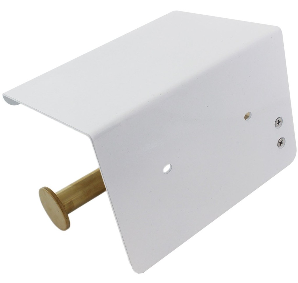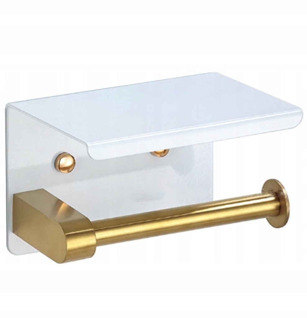 Biało-złoty, stalowy uchwyt na papier toaletowy w stylu loft. Wyposażony w dodatkową półkę umożliwiająca położenie telefonu czy innych drobiazgów. Wykonany z solidnej stali nierdzewnej malowanej proszkowo (odpornej na korozję). Wygodny montaż za pomocą dołączonych elementów montażowych (śruby i podkładki).