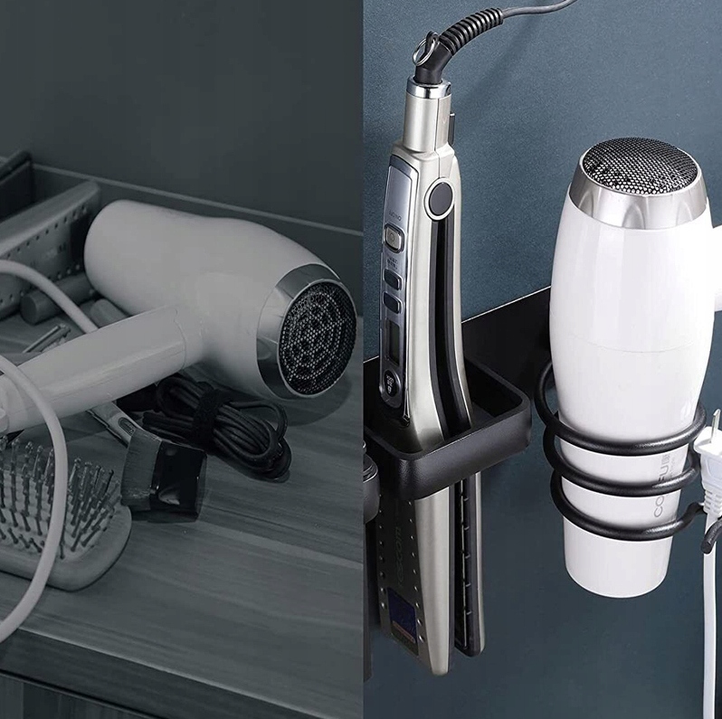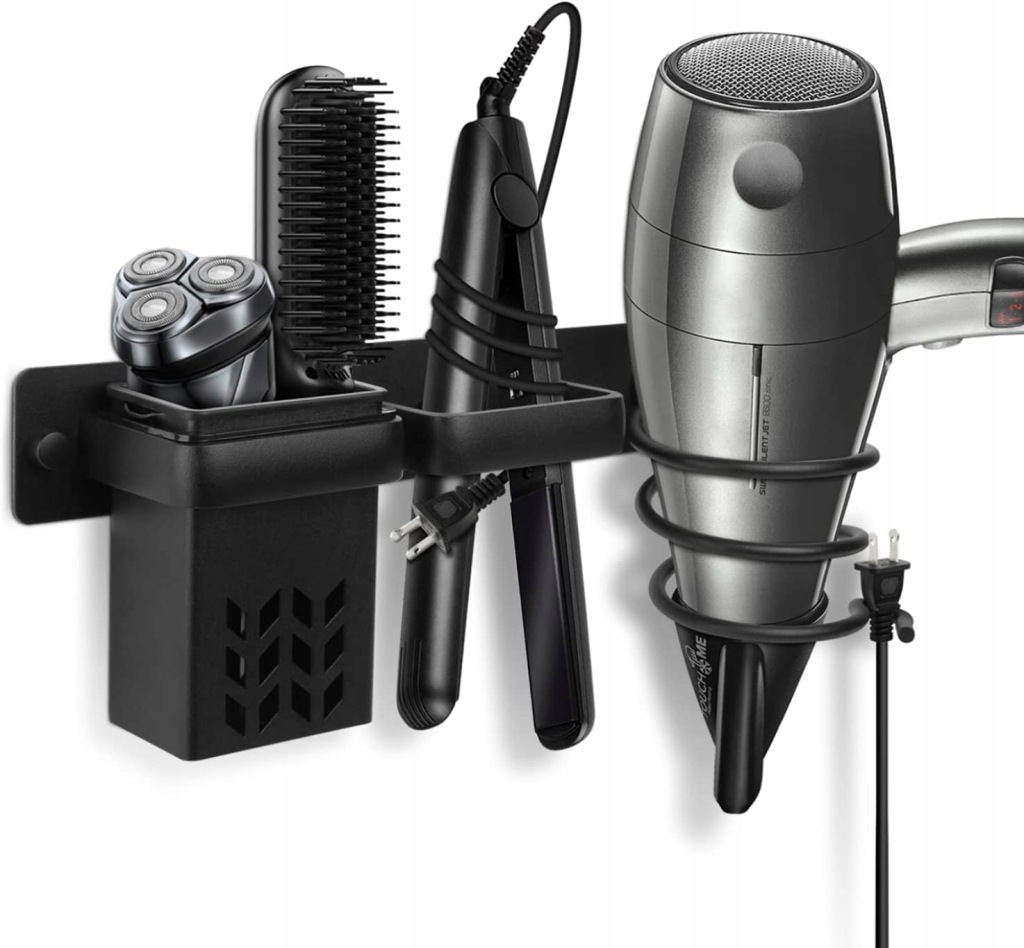 - Ta ścianka uchwytu na suszarkę do włosów ma 3 sekcje, w jednej z nich znajduje się metalowy kubek, dodatkowe miejsce do przechowywania dodatkowych produktów do włosów i kosmetyków.