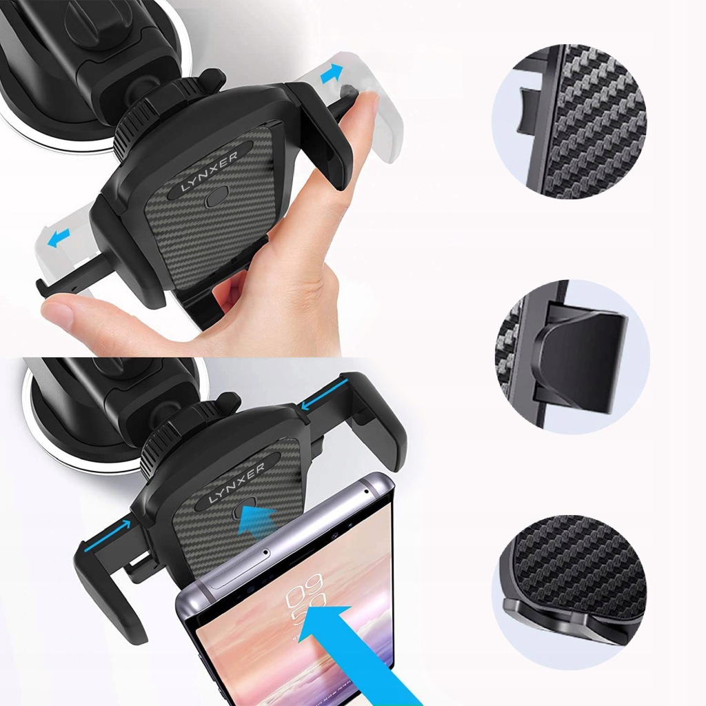 1. Uchwyt zamyka się automatycznie po umieszczeniu w nim urządzenia, przycisk widoczny pod znakiem Lynxer zwalnia sprężyny i zamyka uchwyt.