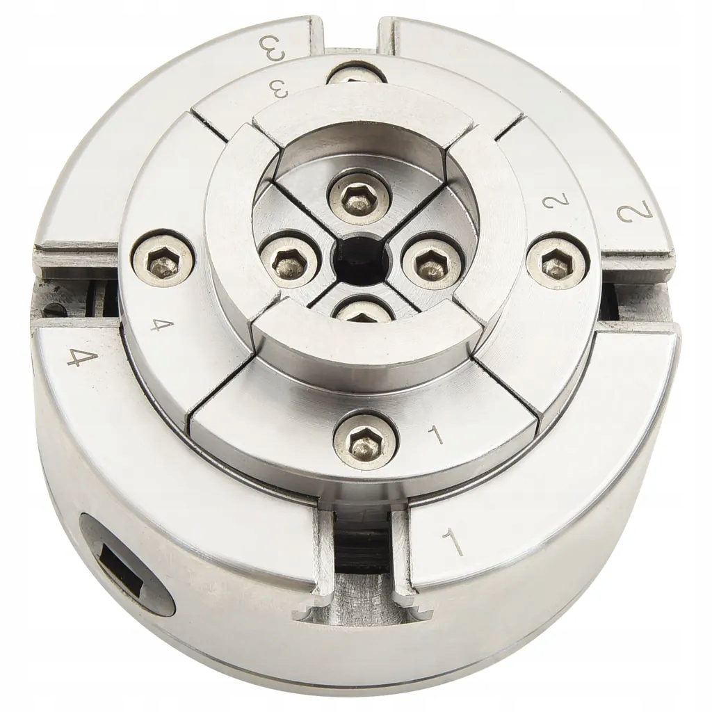 Ten samocentrujący uchwyt wykonano ze stali, dzięki czemu jest mocny i trwały. Zawiera 4 szczęki, jest łatwy w obsłudze i pasuje do wielu różnych tokarek.