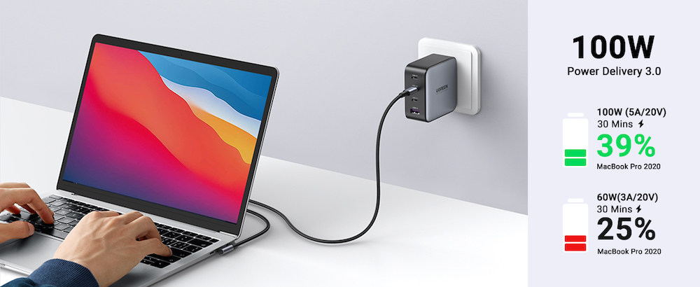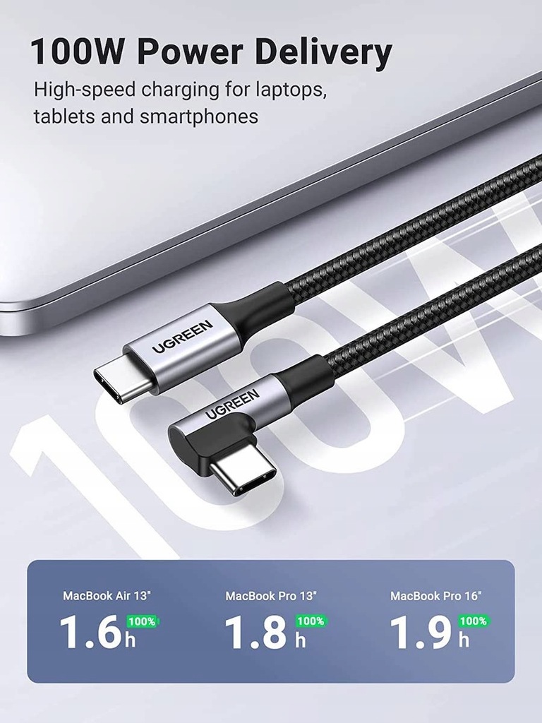 Przewód UGREEN wspiera technologię szybkiego ładowania, co umożliwia z jego pomocą pełne naładowanie MacBook’a w zaledwie 1,5 godziny.