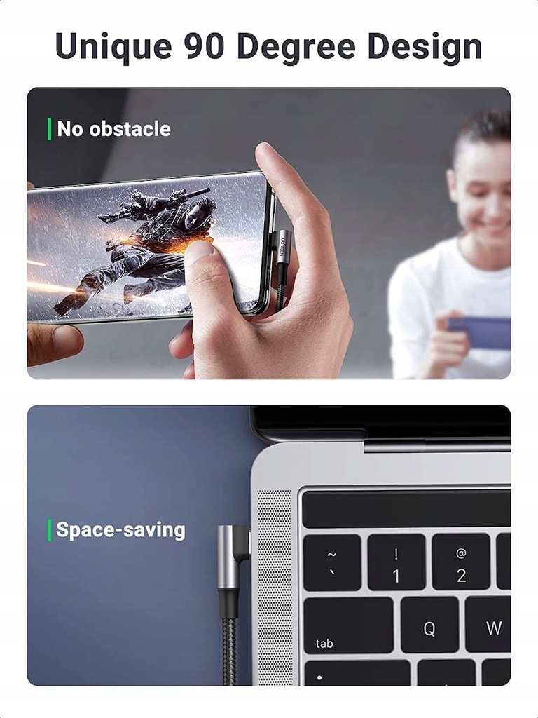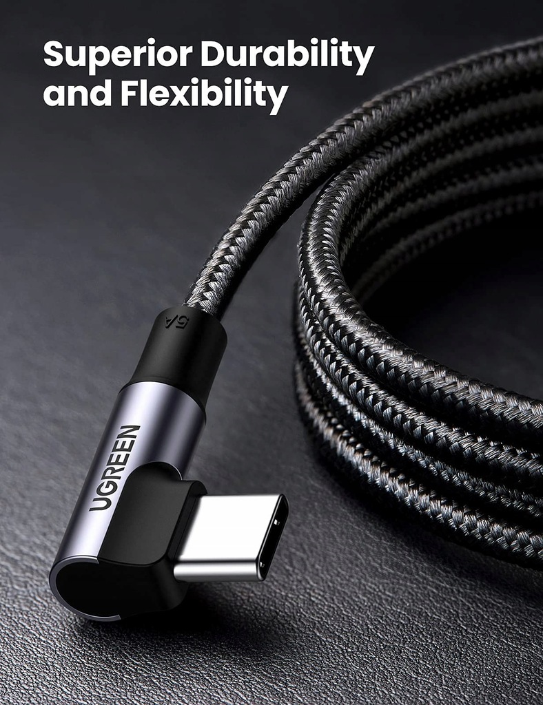Kabel UGREEN USB-C z zakrzywioną końcówką pozwala na szybkie i bezpieczne ładowanie urządzeń mobilnych, niezwykle szybką transmisję danych i wygodne użytkowanie dzięki kątowej końcówce.