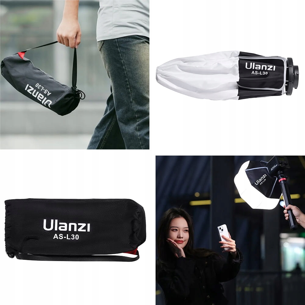 Softbox typu lantern Ulanzi AS-L30 to kompaktowy modyfikator światła przeznaczony do pracy z lampami LED Ulanzi LT028, L023, L024 i bazujący na systemie montażowym Mini Bowens. Średnica jego czaszy wynosi 30 cm, zaś jej głębokość – 25 cm. Oryginalny kształt softboxa zapewnia równomierne rozproszenie wiązki światła we wszystkich kierunkach, tym samym pozwalając jednolicie doświetlić całe pomieszczenie lub niewielki plan zdjęciowy.