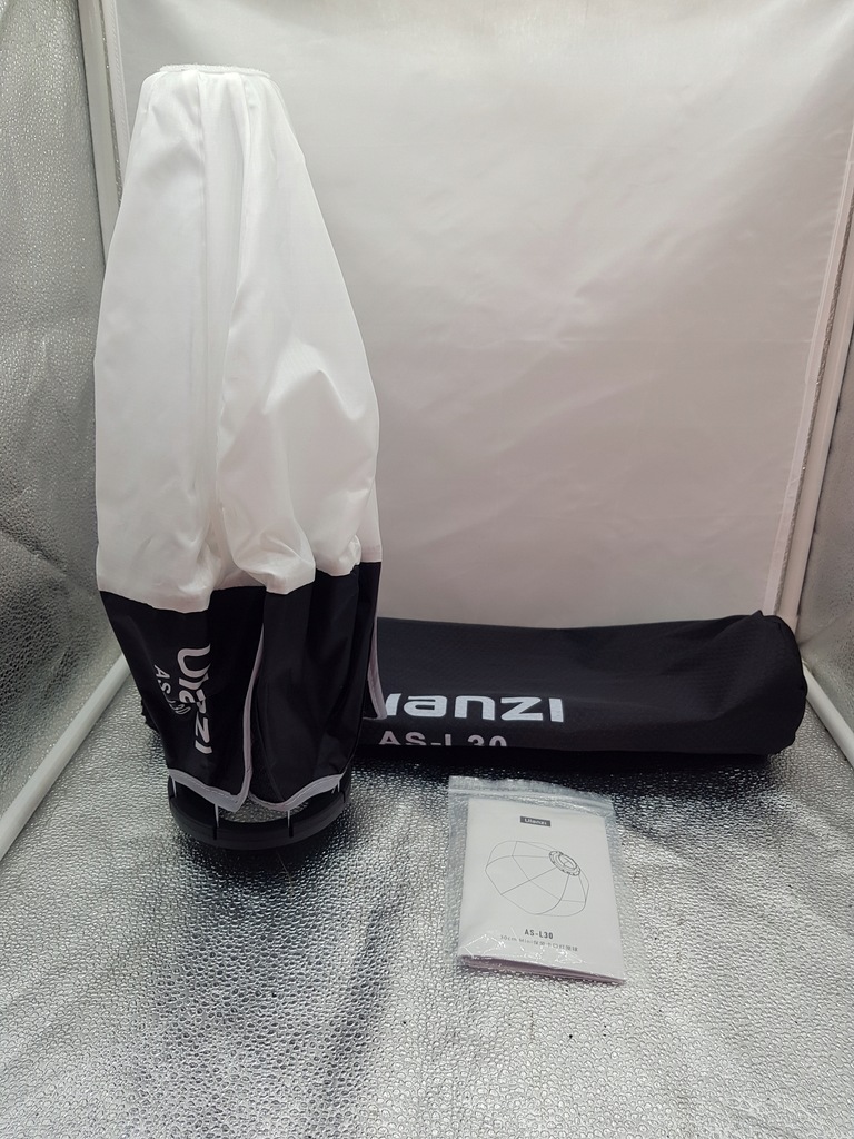 Konstrukcja AS-L30 opiera się na aluminiowym szkielecie i ośmiu elastycznych drutach. Mechanizm szybkiego rozkładania sprawia, że softbox jest gotowy do pracy w zaledwie kilka sekund. Materiał dyfuzyjny posiada wzmocnienie w centralnej, przedniej części, które skutecznie chroni przed przetarciem podczas intensywnego użytkowania. Tuż przy palniku lampy zastosowano srebrne wstawki, które redukują utratę światła i dodatkowo je wzmacniają.