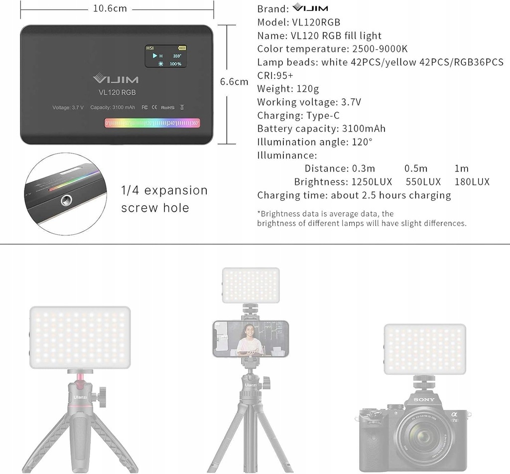 ULANZI VL120 RGB LED oferuje 20 efektów świetlnych, regulację nasycenia kolorów i wyświetlacz LCD do precyzyjnej kontroli parametrów oświetlenia. Zaprojektowana z myślą o kompaktyczności i mobilności, waży tylko 120 g i można zabrać ją ze sobą wszędzie. Dobrze chroni oczy i skutecznie eliminuje cienie, dzięki czemu zapewnia profesjonalne efekty wideo i fotograficzne.