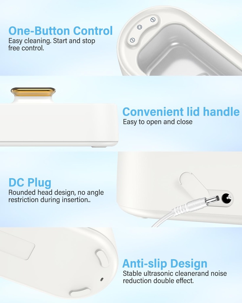 ✅ Głębokie czyszczenie ultradźwiękowe – Myjka ultradźwiękowa wykorzystuje fale dźwiękowe o wysokiej częstotliwości 45 000 Hz, które skutecznie penetrują szczeliny i zagłębienia. Dzięki temu dokładnie usuwa uporczywe zabrudzenia i osady z takich przedmiotów jak okulary, protezy, aparaty ortodontyczne, biżuteria, końcówki szczoteczek elektrycznych, smoczki i inne akcesoria.