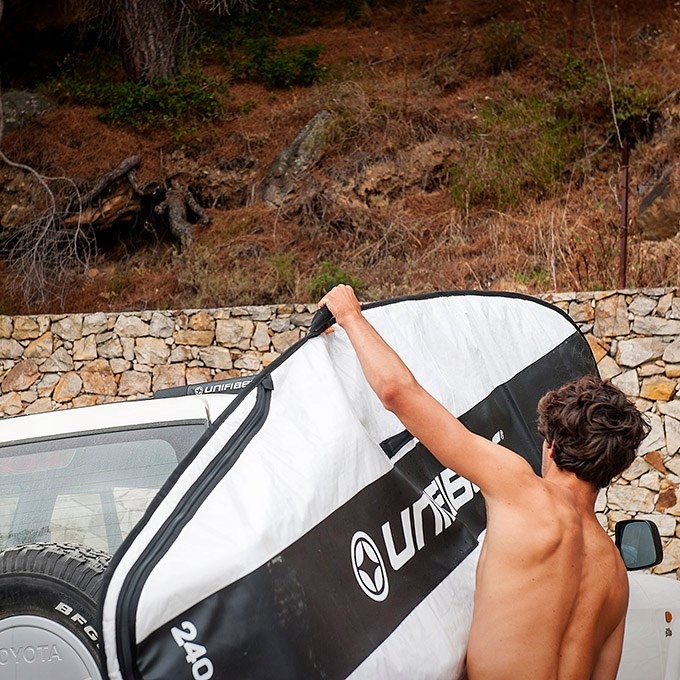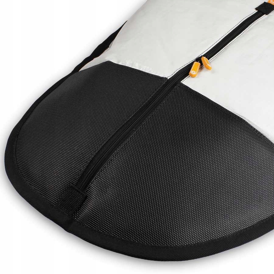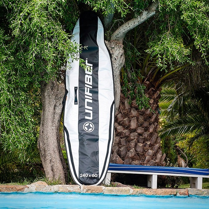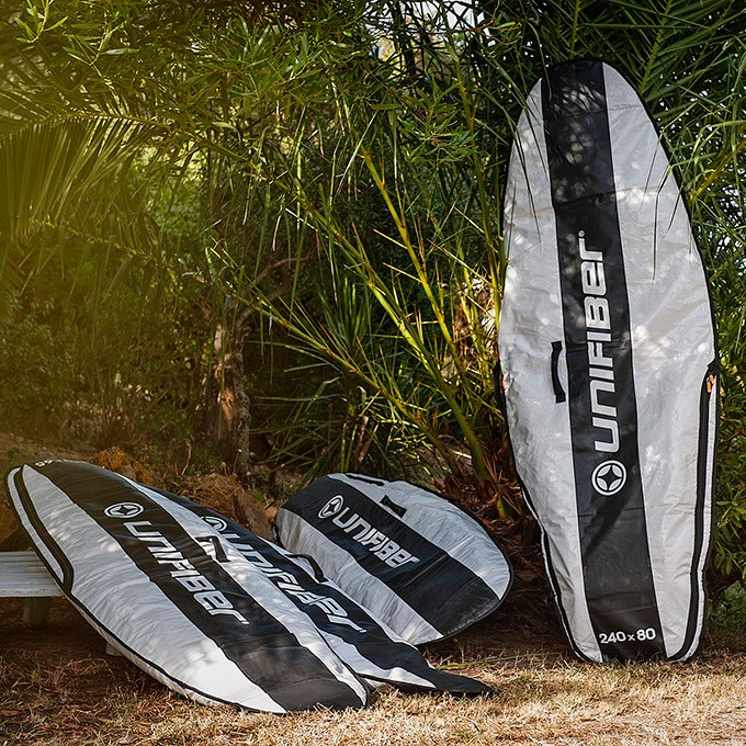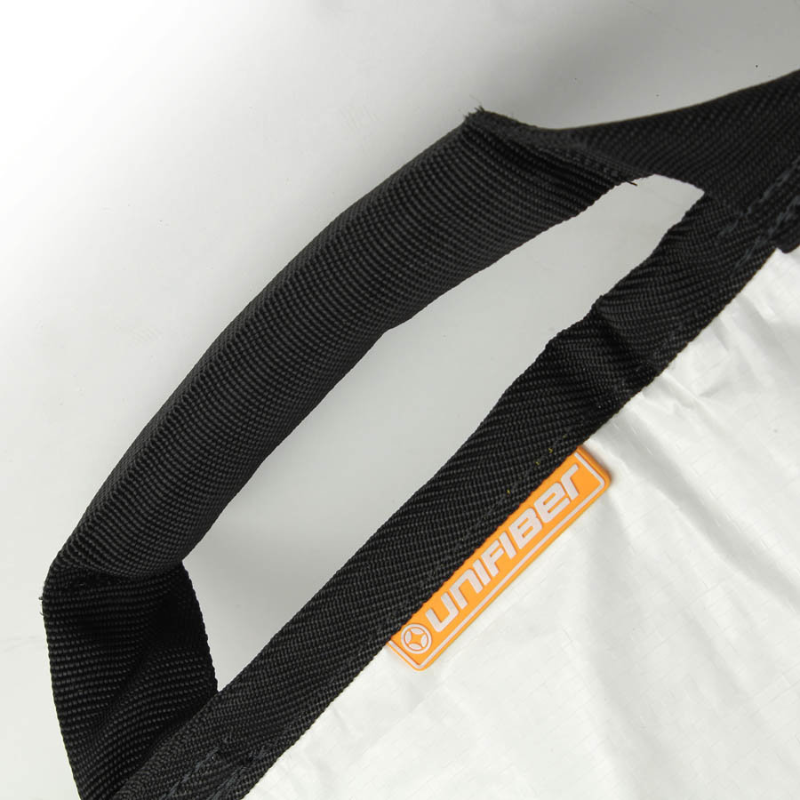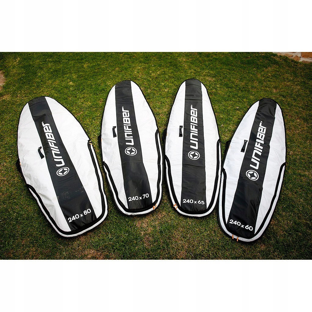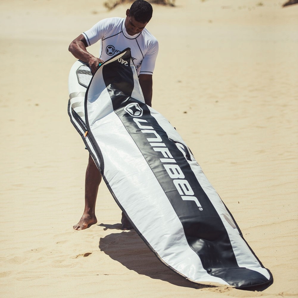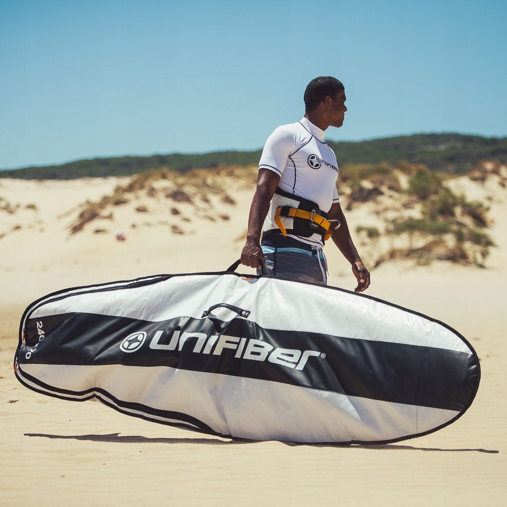 Solidny, porządnie wykonany pokrowiec na deskę windsurfingową. Posiada grubą wyściółkę, dodatkowo wzmocnioną na dziobie i rufie. Zapewnia najlepszą amortyzację uderzeń w trakcie transportu. Wykonany z grubego, nieprzemakalnego materiału, który jednocześnie chroni deskę przed promieniami słonecznymi. Stanowi on najlepszą ochronę dla Twojej deski zarówno podczas transportu jak i przechowywania jej np. po zakończeniu sezonu. Wyposażona w podwójną rączkę ułatwiającą przenoszenie oraz solidny zamek, umieszczony tak, aby nie uszkodził i nie porysował deski. Zamek na spodzie pokrowca pozwala na przechowywanie deski bez konieczności wykręcania statecznika. Pokrowiec zapewnia również ochronę gdy deska stoi pionowo. Jest to najmocniejszy i najbardziej wytrzymały pokrowiec Unifiber'a.