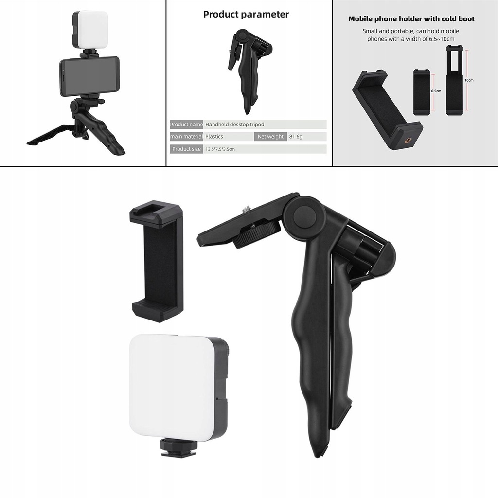 Desktop tripod and cold shoe mount, 1/4 inch screws, can be extended to more photography accessories, like the and LED light.