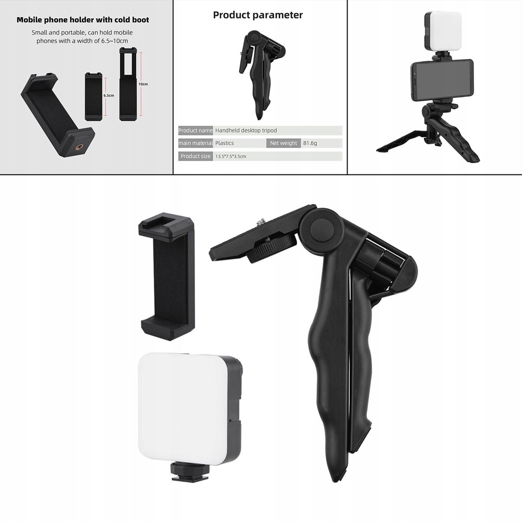 Desktop tripod and cold shoe mount, 1/4 inch screws, can be extended to more photography accessories, like the and LED light.