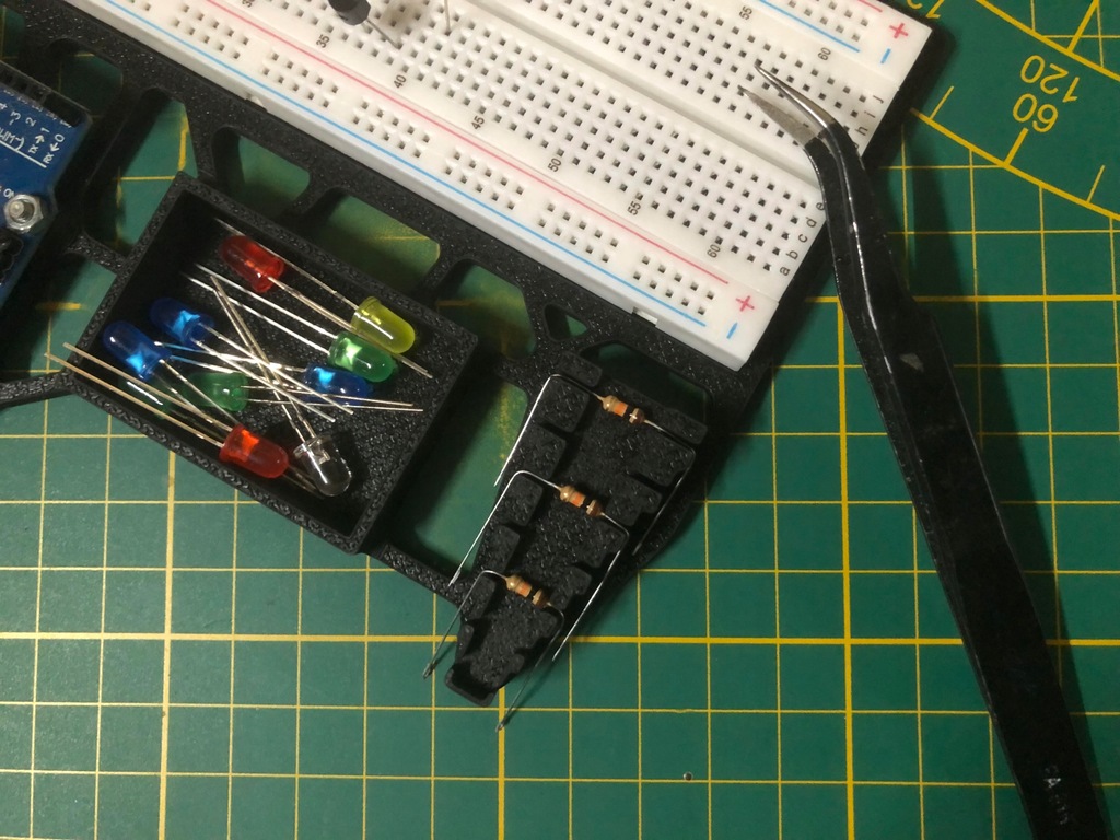 Wbudowany pojemnik mimo swojej prostoty, jest bardzo praktycznym elementem płyty projektowej. Nie trzeba martwić się o drobne części i komponenty, które znikają bez śladu na stole roboczym, gdy ma się pod ręką dedykowaną przestrzeń na odłożenie elementu.