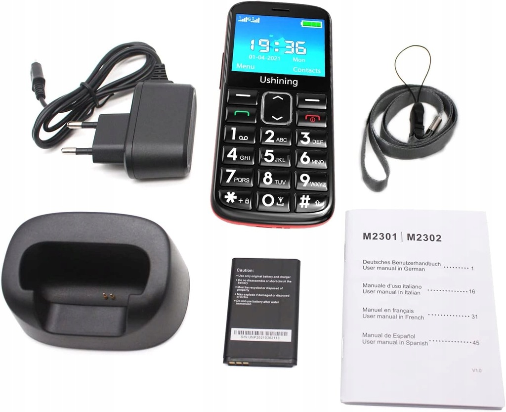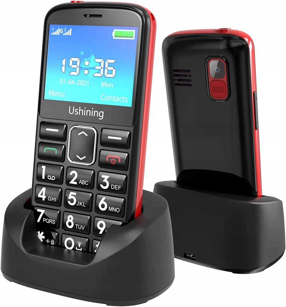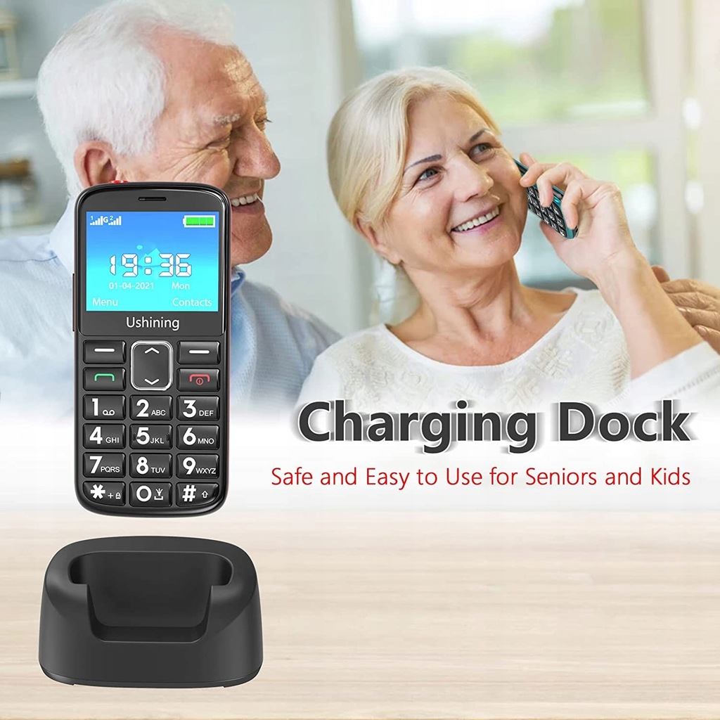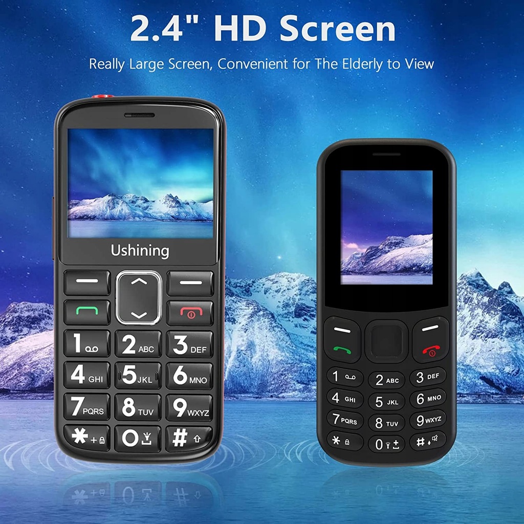 Telefony komórkowe dla seniorów USHINING odblokowane za pomocą przycisku SOS kompatybilne z telefonami komórkowymi 3G T dla seniorów, dużym ekranem HD o przekątnej 2,4 cala, podstawowymi telefonami komórkowymi ze stacją ładującą