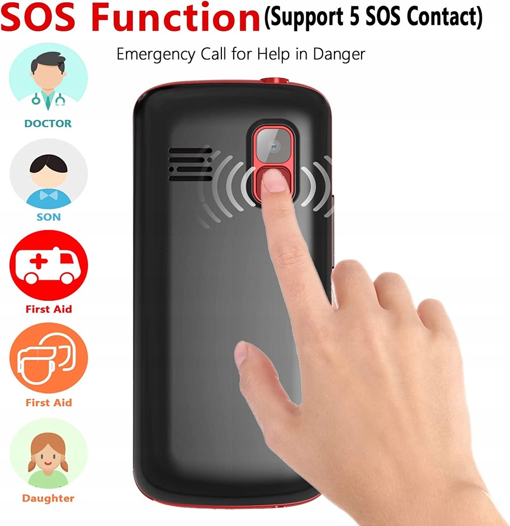 Przycisk alarmowy SOS: telefon komórkowy dla seniorów z przyciskiem alarmowym SOS, za pomocą którego w nagłym przypadku można wykonać połączenie lub wysłać SMS do preferowanych kontaktów. Ten telefon komórkowy obsługuje również szybkie wybieranie (dedykowane numery 2, 3, 4, 5, 6, 7, 8, 9).