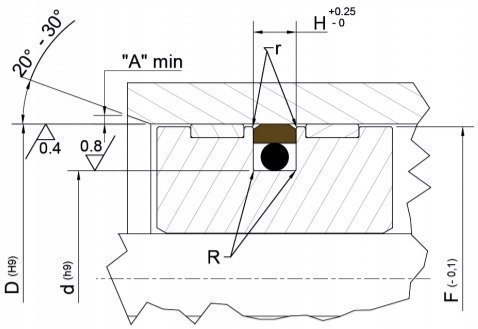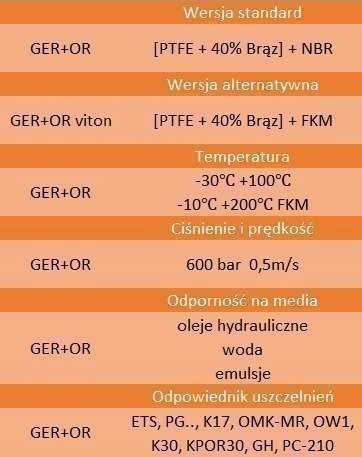 Uszczelnienie tłokowe dwustronnego działania, składające się z pierścienia (PTFE + Brąz) i O-ringa (NBR) jako elementu dociskowego. Wykazuje doskonałe właściwości uszczelniające oraz wysoką odporność na zużycie i korozję.