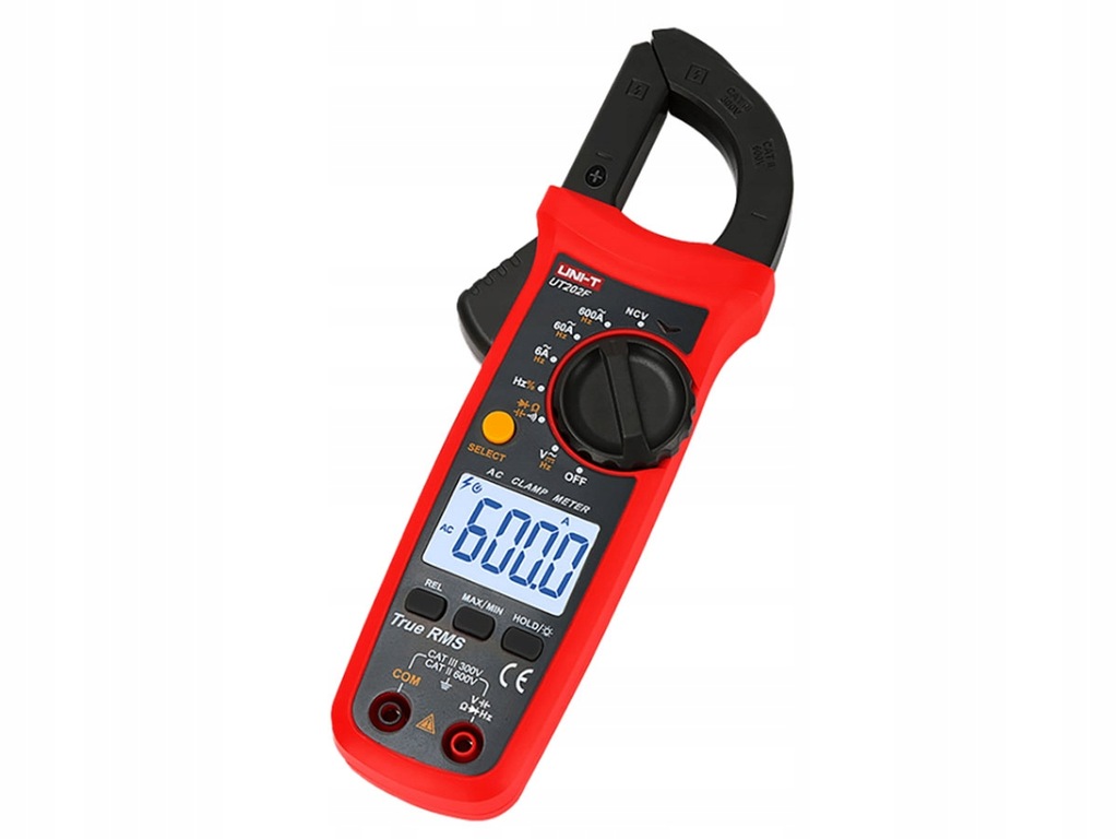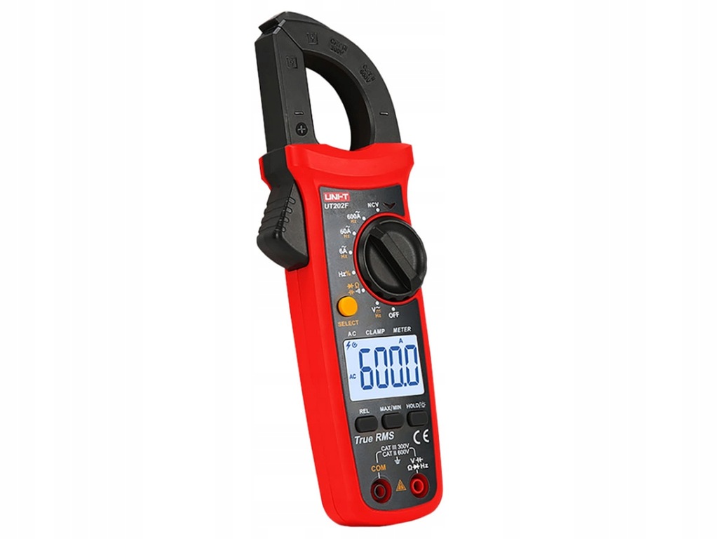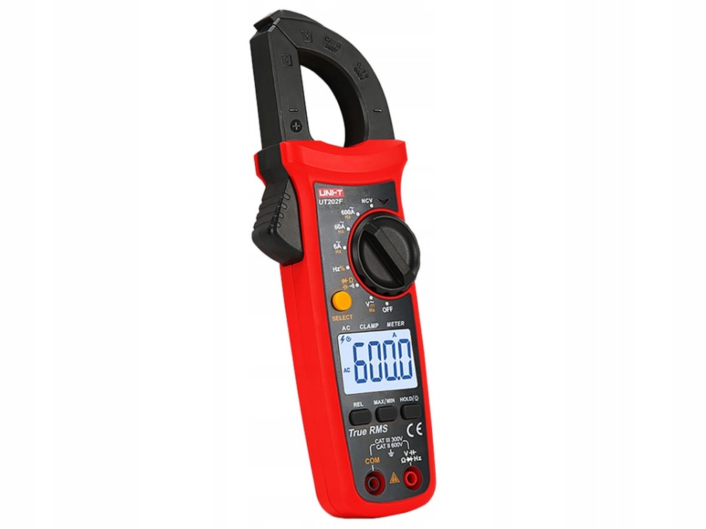 UT202F produkcji Uni-T to prosty i poręczny miernik cęgowy do pomiaru prądu przemiennego AC do 600A TrueRMS. Oprócz pomiaru prądu przy pomocy cęg multimetr UT202F umożliwia przewodowy pomiar napięcia AC/DC, pomiar rezystancji, pomiar diod, pomiar pojemności kondensatorów, akustyczny pomiar ciągłości obwodów, pomiar natężenia pola elektromagnetycznego. Z dodatkowych funkcji mamy możliwość zarejestrowania wartości MAX i MIN w trakcie trwania pomiaru, funkcję zatrzymania wskazania na wyświetlaczu Data HOLD, funkcje REL czyli pomiarów względnych pozwalający wyzerować wskazania miernika oraz bezprzewodowe wykrywanie napięcia AC (NCV). Multimetr UT202F wyposażony jest w wyświetlacz LCD o maksymalnym wskazaniu wyniku pomiarowego 6000. Miernik cęgowy UT202F ma funkcję True RMS - pomiar wartości skutecznej.