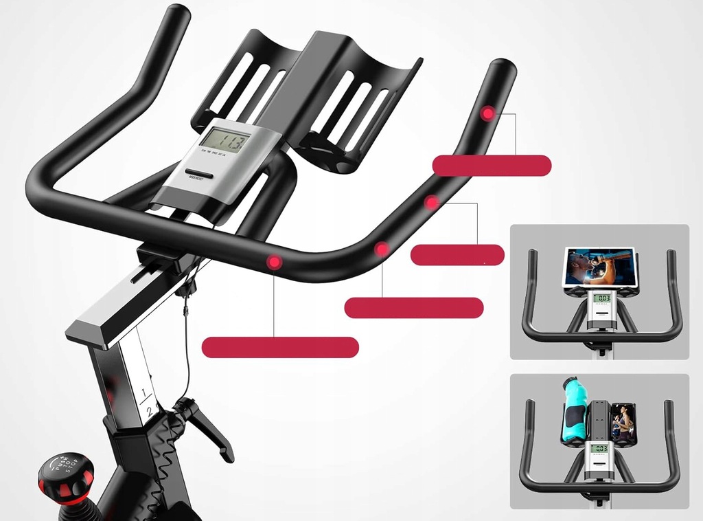 【Bezpieczeństwo i Wygoda】 - Hamulec bezpieczeństwa i wypustka na rurze regulującej kierownicę dla większego bezpieczeństwa. Uniwersalny uchwyt może pomieścić tablet, telefon, bidon i inne przedmioty. 2 kółka transportowe ułatwiają przemieszczanie, a cyfrowy monitor ułatwia śledzenie danych treningowych.