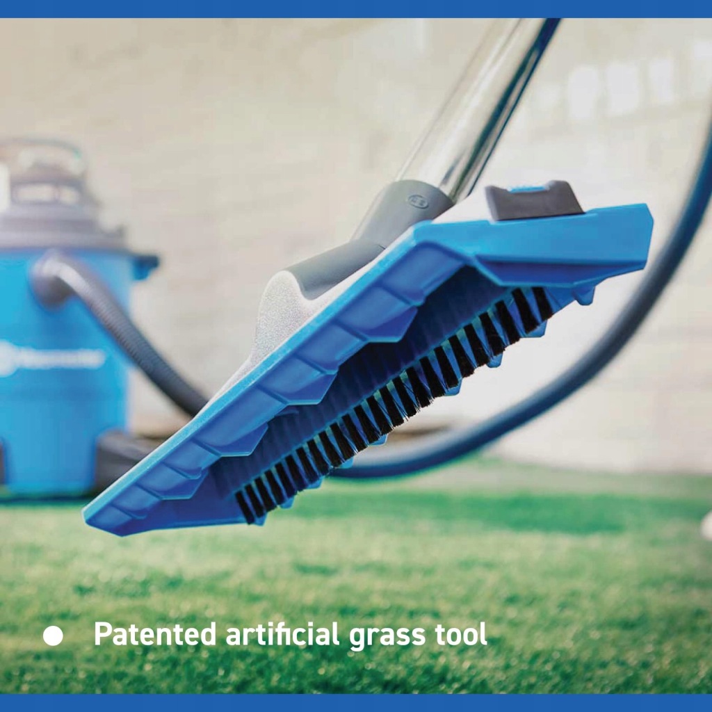 NARZĘDZIA SPECJALISTYCZNE. Narzędzie do sztucznej trawy jest odporne na zabrudzenia i delikatne dla sztucznej trawy. Ukształtowane grzebienie usuwają brud i kurz z trawy, a nylonowe szczotki usuwają uwięziony brud. Mosiężna szczotka usuwa mech i chwasty z plam po kamieniach. W zestawie znajduje się również uniwersalna głowica podłogowa do czyszczenia wnętrz