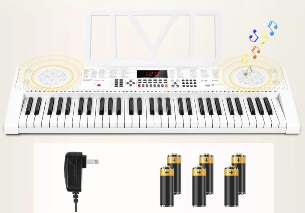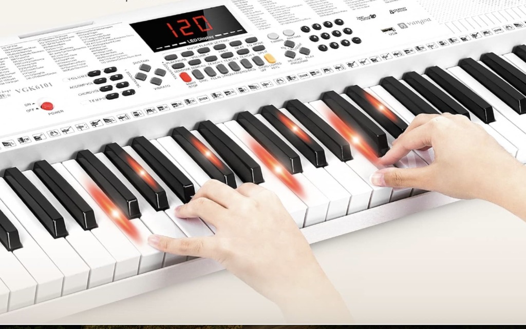 Vangoa klawiatura fortepianowa 61 podświetlany klawisz klawiatura muzyczna ze stojakiem, słuchawka, mikrofon, 600 kolorów, 400 rytmów, 30 demonstracji, biała