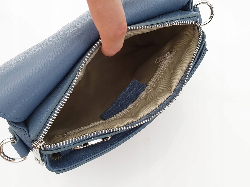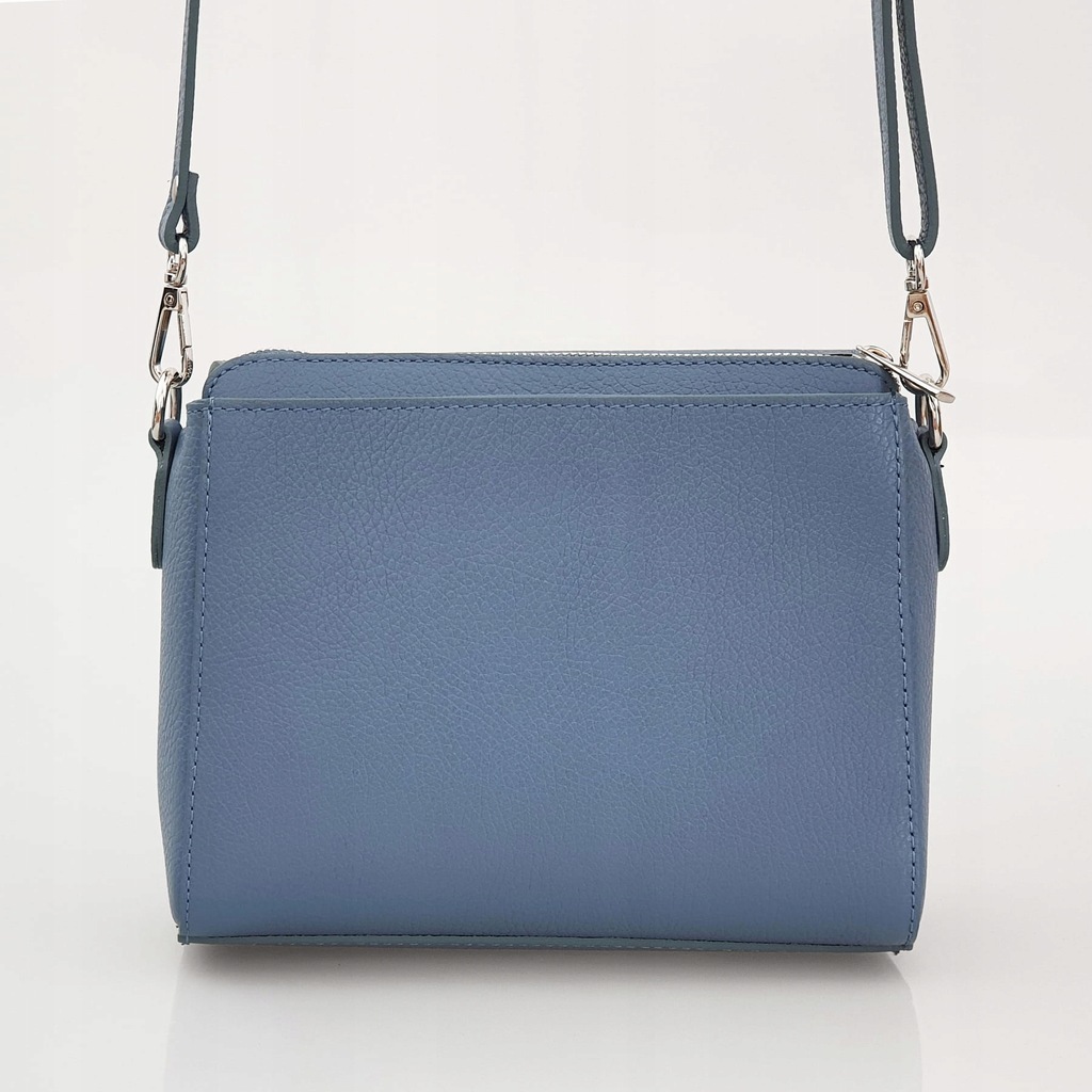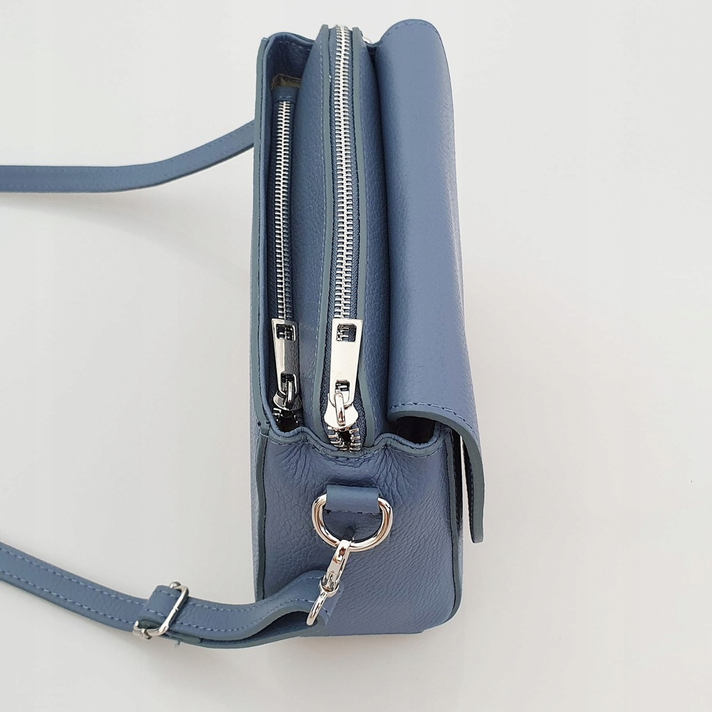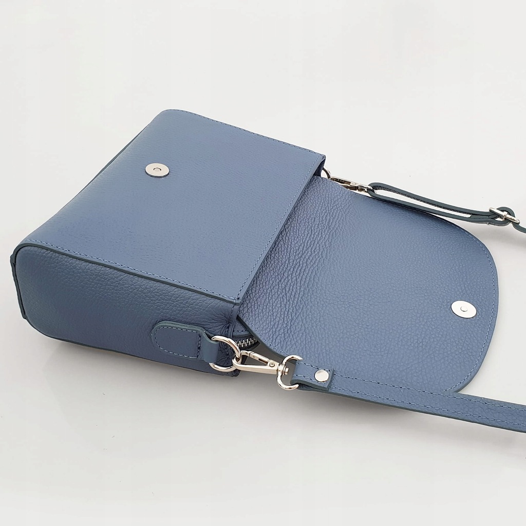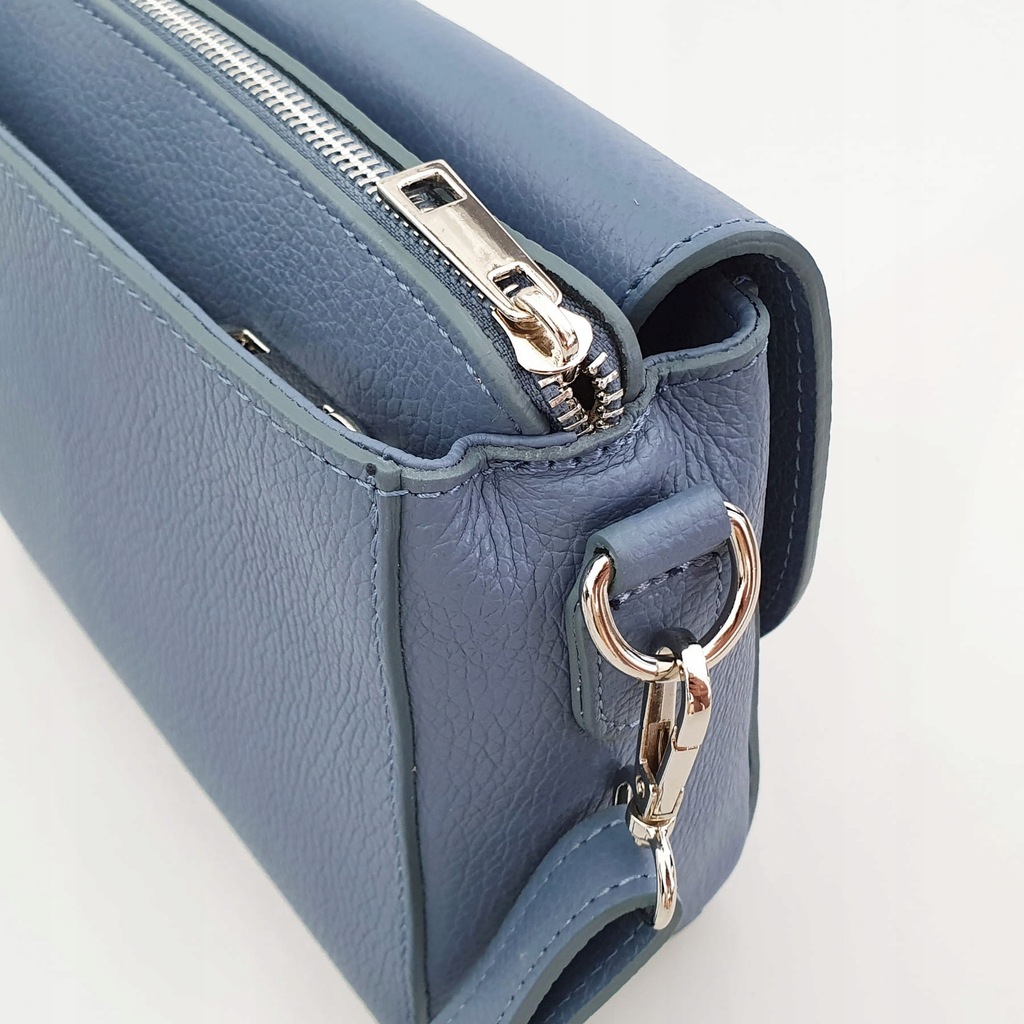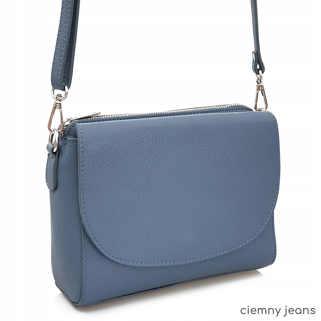 Włoska skórzana torebka listonoszka znanej i cenionej marki VERA PELLE ITALY w kolorze CIEMNEGO JEANSU. Wyprodukowana została bardzo starannie z dbałością o najmniejsze szczegóły z najwyższej jakości włoskiej skóry naturalnej. Torebka posiada okucia w kolorze srebrnym. Jest bardzo pojemna i praktyczna ponieważ posiada 3 niezależne komory. Przednia zamykana jest na magnesik a 2 pozostałe na suwak. Środek wykończony jest wysokiej jakości podszewką. Dodatkowo w środku w głównej komorze znajduje się dodatkowa nieduża kieszonka zamykana na suwak. Idealnie się sprawdzi do oddzielenia telefonu lub dokumentów od pozostałej zawartości torebki. Do torebki dołączony jest długi, wykonany ze skóry pasek o maksymalnej długości 130 cm. Pasek oczywiście jest regulowany, dzięki czemu można torebkę idealnie dopasować do wzrostu i preferencji. Torebka posiada usztywnione dno i z uwagi na grubą skórę, bardzo ładnie trzyma swój fason nawet bez jakiejkolwiek zawartości. Klasyczny wygląd listonoszki powoduje, ze będzie pasowała niemal do każdej codziennej i wizytowej stylizacji.