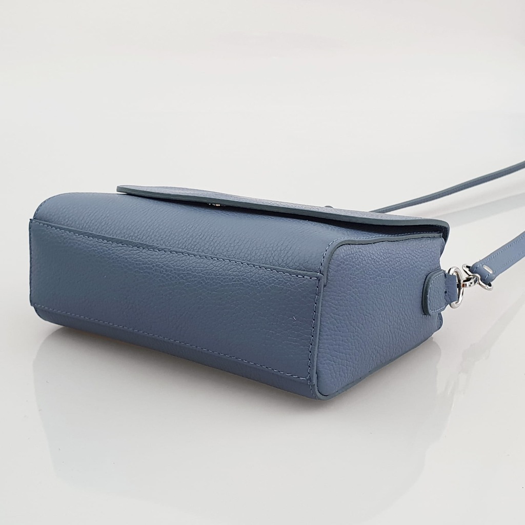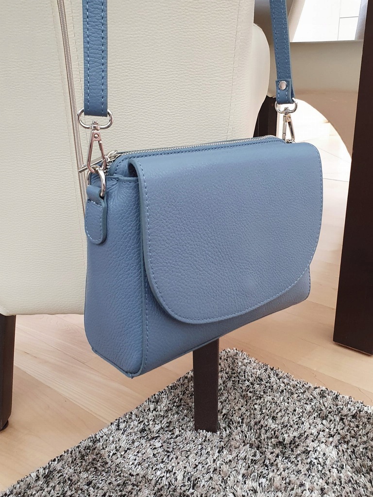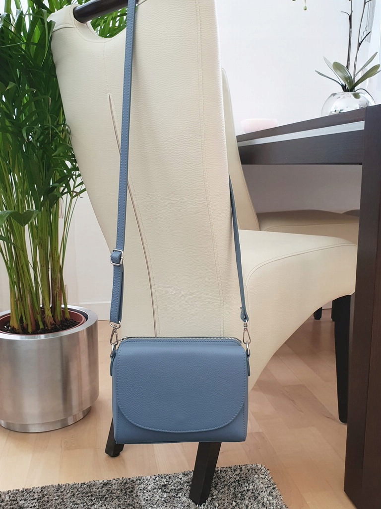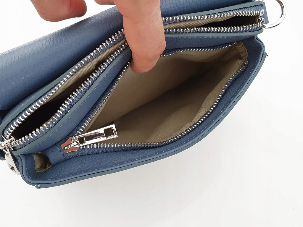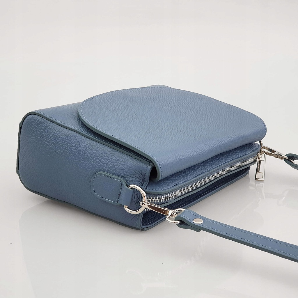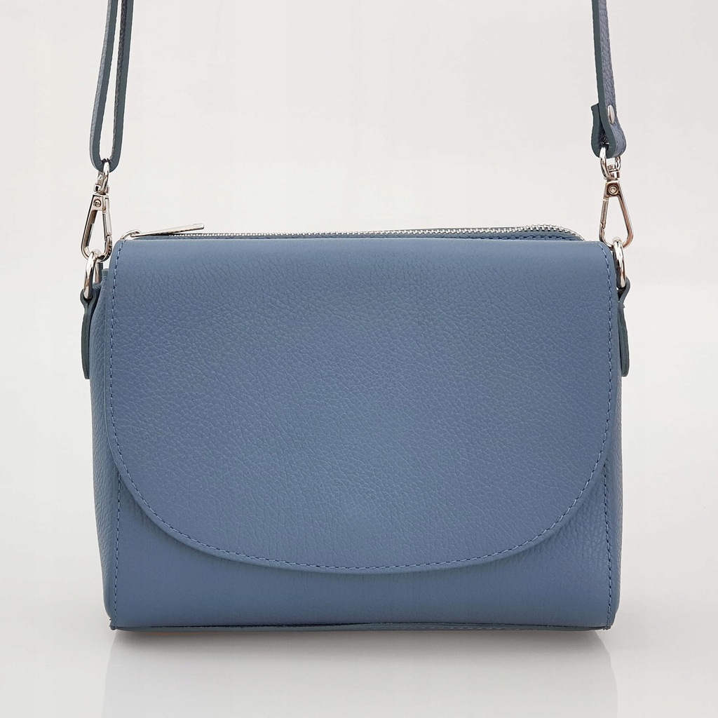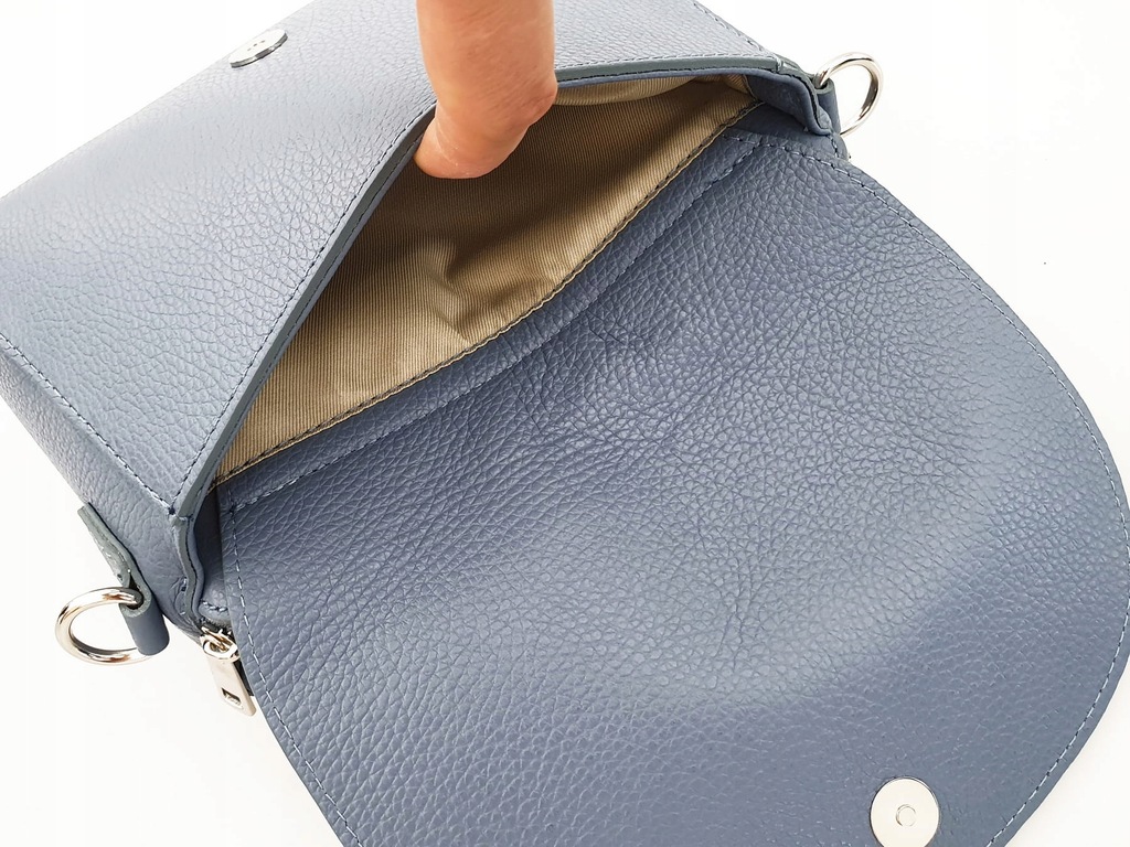 Włoska skórzana torebka listonoszka znanej i cenionej marki VERA PELLE ITALY w kolorze CIEMNEGO JEANSU. Wyprodukowana została bardzo starannie z dbałością o najmniejsze szczegóły z najwyższej jakości włoskiej skóry naturalnej. Torebka posiada okucia w kolorze srebrnym. Jest bardzo pojemna i praktyczna ponieważ posiada 3 niezależne komory. Przednia zamykana jest na magnesik a 2 pozostałe na suwak. Środek wykończony jest wysokiej jakości podszewką. Dodatkowo w środku w głównej komorze znajduje się dodatkowa nieduża kieszonka zamykana na suwak. Idealnie się sprawdzi do oddzielenia telefonu lub dokumentów od pozostałej zawartości torebki. Do torebki dołączony jest długi, wykonany ze skóry pasek o maksymalnej długości 130 cm. Pasek oczywiście jest regulowany, dzięki czemu można torebkę idealnie dopasować do wzrostu i preferencji. Torebka posiada usztywnione dno i z uwagi na grubą skórę, bardzo ładnie trzyma swój fason nawet bez jakiejkolwiek zawartości. Klasyczny wygląd listonoszki powoduje, ze będzie pasowała niemal do każdej codziennej i wizytowej stylizacji.
