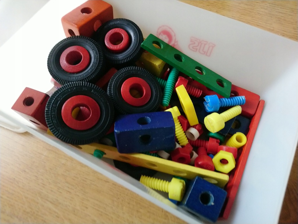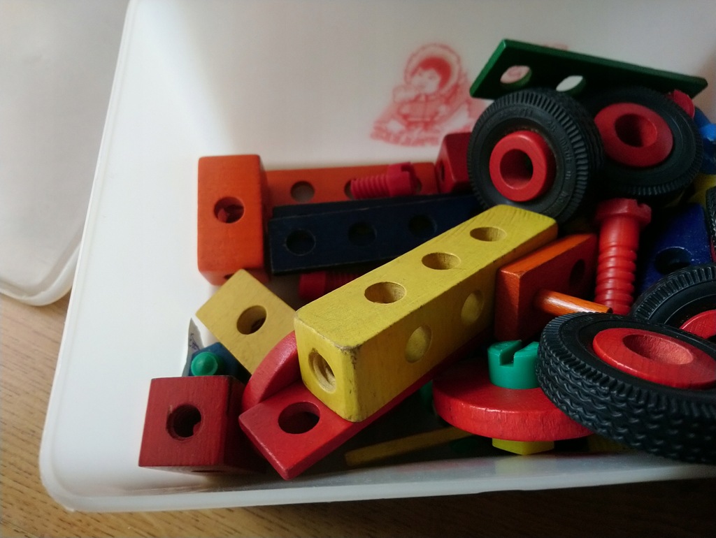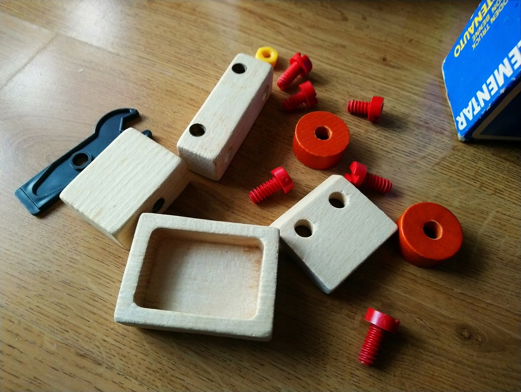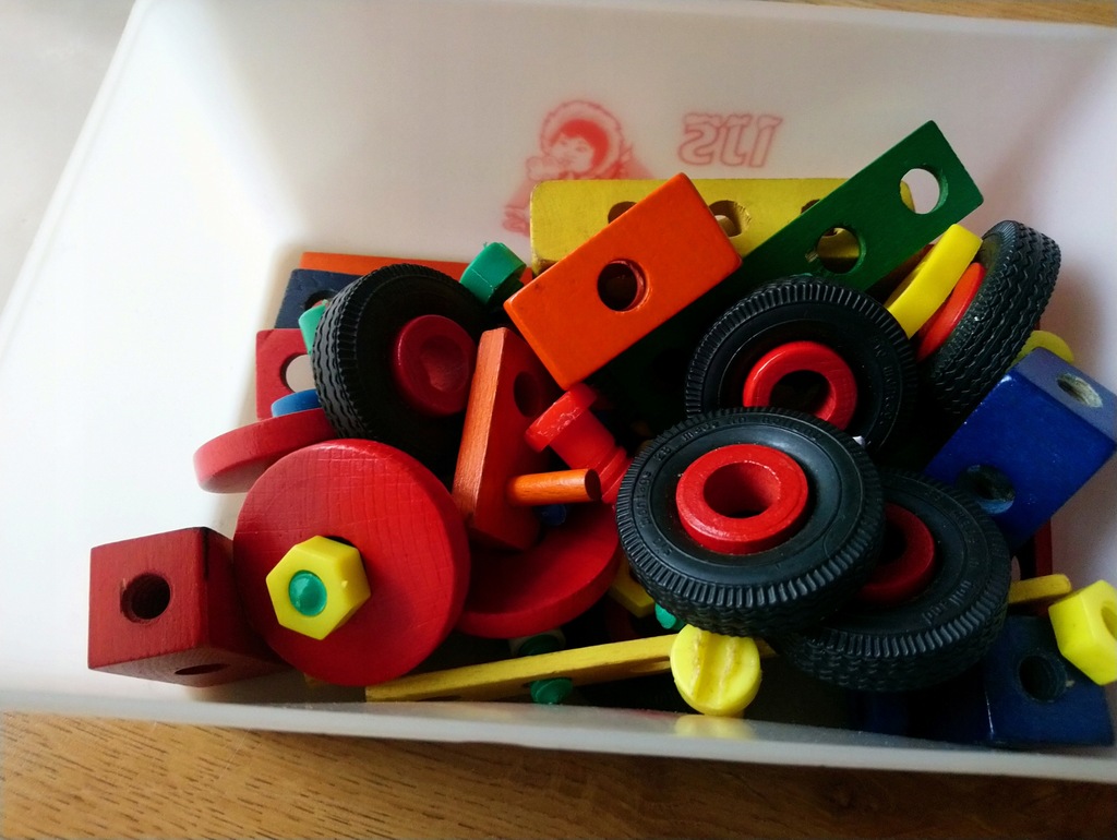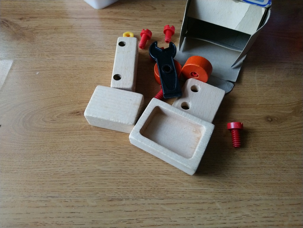 Spory zestaw klocków drewnianych + plastikowe śruby łączące. Niestety zestaw VERO (ten w kartonowym pudełku) niekompletny. Dorzucam plastikowe pudełko z klockami gratis. Wysyłam oba zestawy :)