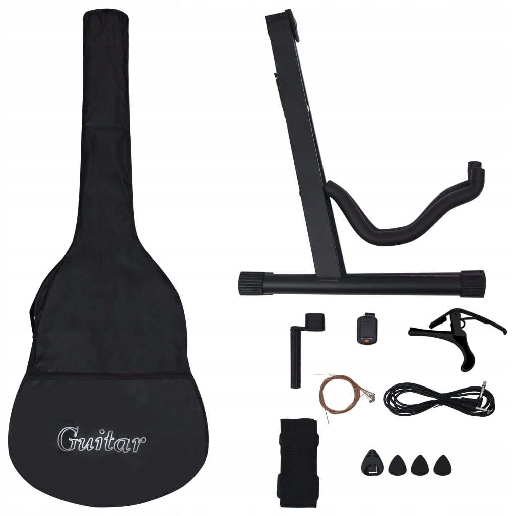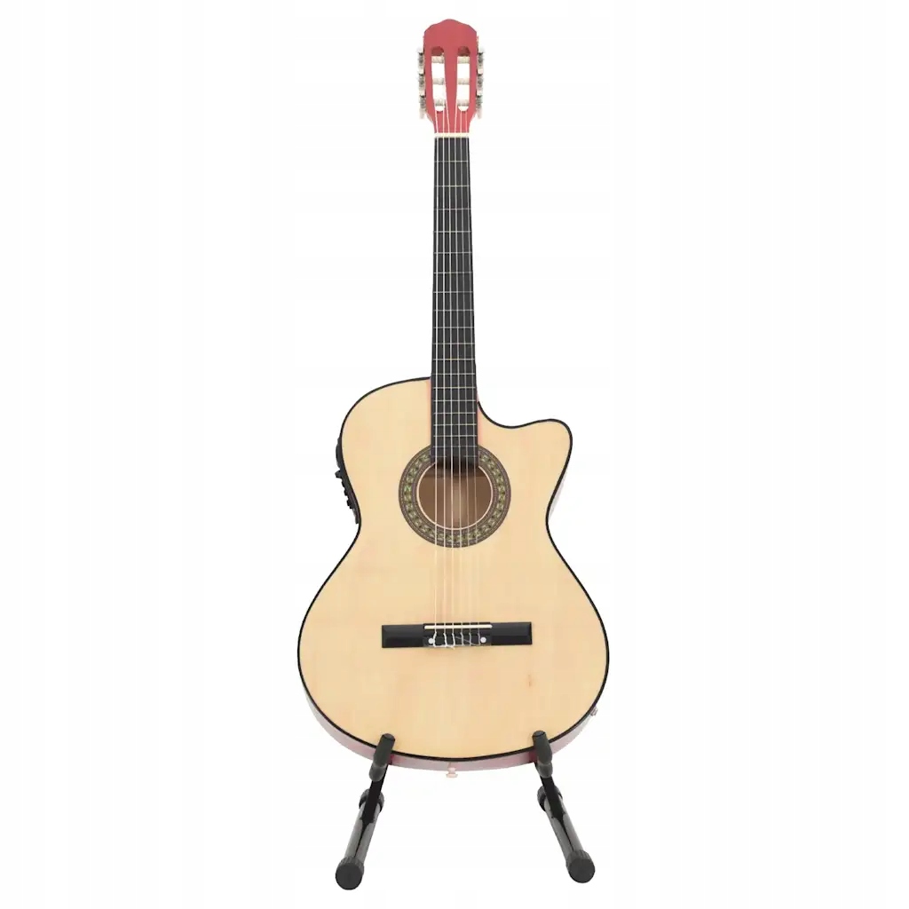 Nasza westernowa gitara z wycięciem to świetny instrument dla początkujących, amatorów i muzyków na każdym poziomie. Oprócz gitary w zestawie znajduje się pokrowiec na gitarę, pasek, kostki, uchwyt na kostkę, zestaw strun, korbka do strun, kapodaster, tuner chromatyczny i stojak na gitarę. Gitara jest wykonana z litego drewna lipowego z kluczami i podstrunnicą z twardego plastiku. Ma 6 strun i 4-pasmowy equalizer. Po podłączeniu do głośnika equalizer oferuje funkcję strojenia gitary. Doskonała jakość dźwięku i piękny design sprawiają, że instrument jest bardzo ceniony. Ta gitara o długości menzury wynoszącej 65 cm ma wszystko, czego potrzebujesz, aby zostać gitarzystą lub gitarzystką. Tuner pozwala lepiej nastroić struny gitary, a kapodaster dopasować tonację. 3 kostki służą do szarpania strun i można je umieścić w uchwycie. Zwykle służą w zastępstwie palców, ale można też grać nimi i palcami jednocześnie. Korbka do strun to przydatne narzędzie, ułatwiające wymianę strun. Dołączony pokrowiec z paskiem jest idealny dla podróżujących muzyków i ułatwia przechowywanie instrumentu. Dodatkowo możesz umieścić gitarę na stojaku, co jest bardzo wygodne. Montaż naszego zestawu gitarowego jest prosty.