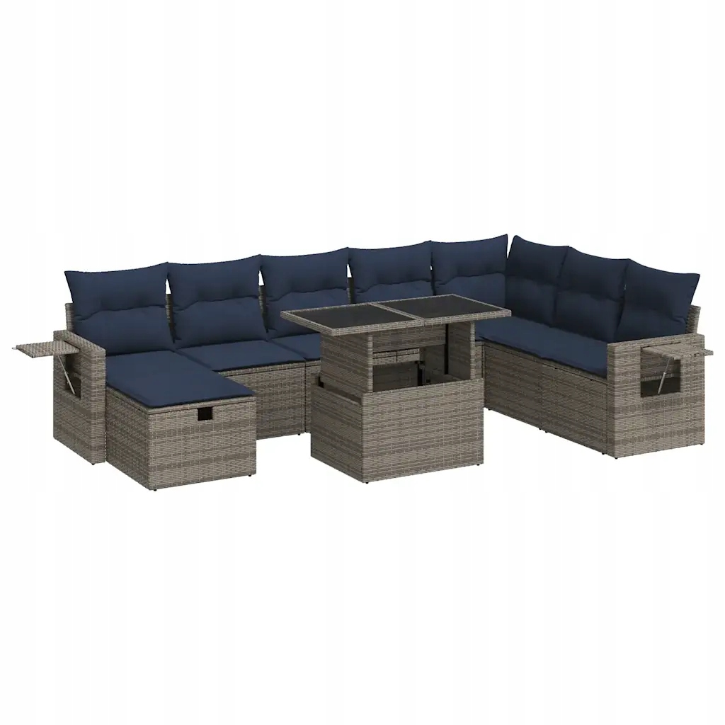 Ten zestaw wypoczynkowy będzie fantastycznym dodatkiem na Twoje podwórko, taras lub patio, tworząc wygodną i zachęcającą przestrzeń do spotkań z rodziną i przyjaciółmi oraz relaksu na świeżym powietrzu.Trwały materiał: rattan PE, znany również jako polirattan, to trwałe i łatwe w utrzymaniu tworzywo sztuczne, które wyglądem przypomina naturalny rattan. Jest lekki, łatwy w czyszczeniu i powszechnie stosowany do wyrobu produktów przeznaczonych do użytku na zewnątrz, ze względu na swoją trwałość i odporność na czynniki atmosferyczne.Schowek z wodoodporną torbą: pod siedziskiem każdego mebla znajduje się schowek z wodoodporną torbą do przechowywania poduszek, zabawek i innych przedmiotów. Worki te mają górną klapkę i można je solidnie przymocować do siedzisk za pomocą rzepów.Poręczny stolik boczny: ten mebel ogrodowy jest wyposażony w składany stolik boczny ze sprężyną gazową, dzięki czemu możesz mieć pod ręką wszystkie niezbędne rzeczy.Zdejmowane poszewki z możliwością prania: poduszki na siedzisko mają zdejmowane poszewki, które można prać.Modułowa konstrukcja: ten zestaw mebli ogrodowych jest modułowy, co zapewnia całkowitą swobodę w aranżacji i łatwość przestawiania.Warto wiedzieć:Aby utrzymać meble ogrodowe w dobrej kondycji, zalecamy zabezpieczenie ich wodoszczelnym pokrowcem.