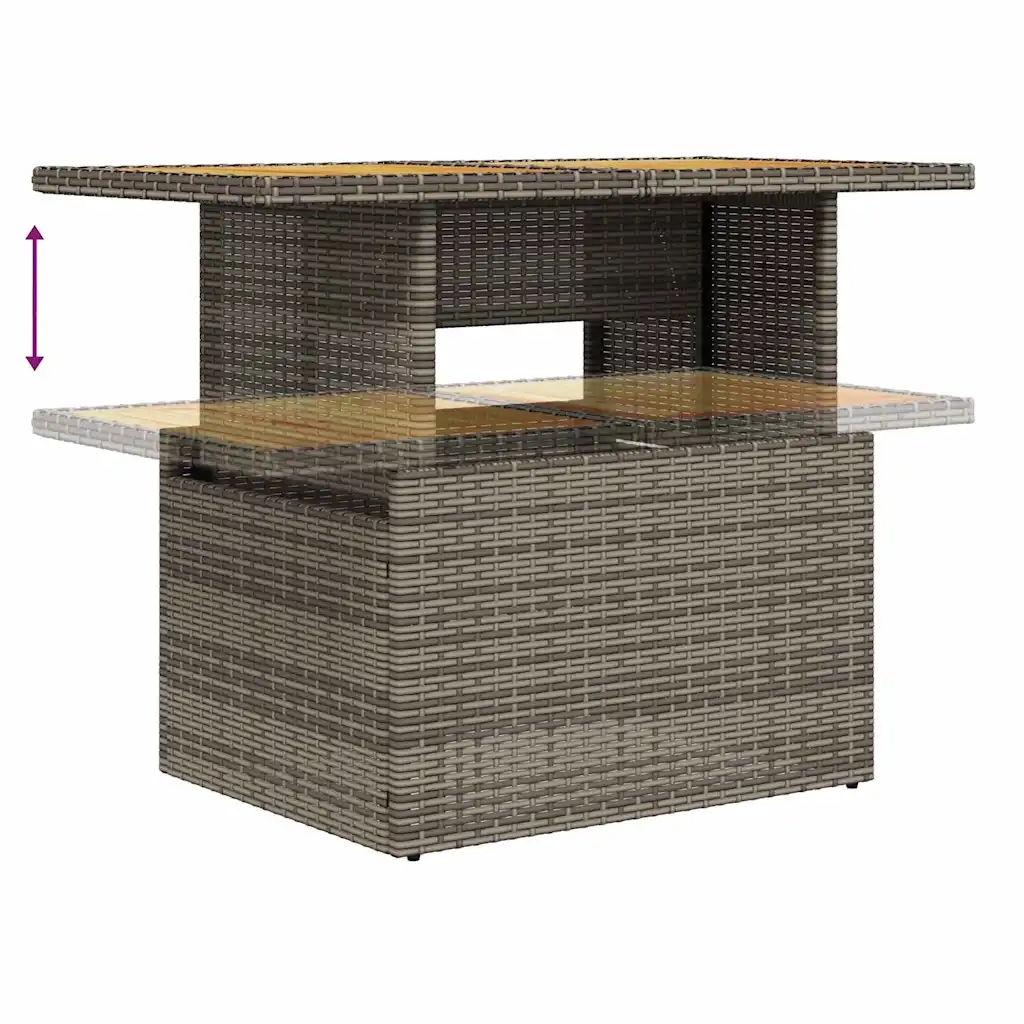 - Materiał: rattan PE, stal malowana proszkowo, lite drewno akacjowe wykończone olejem