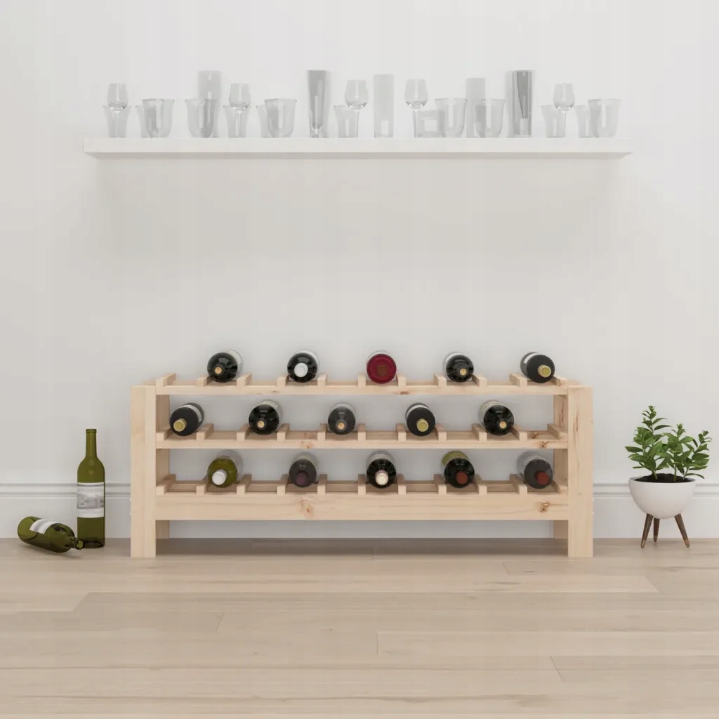 Przechowuj, pozwól dojrzewać i eksponuj swoje wino w dobrym stylu dzięki temu stojakowi z surowego drewna mango! Lite drewno sosnowe: lite drewno to piękny, naturalny materiał. Drewno sosnowe ma prostą strukturę słojów, a sęki nadają mu wyjątkowy, rustykalny wygląd.Sporo miejsca do przechowywania: stojak na wino oferuje sporo miejsca na Twoje trunki. Idealnie nadaje się do przechowywania do 30 butelek wina. Solidna rama: rama z drewna zapewnia trwałość i stabilność konstrukcji. Ostrzeżenie:aby zapobiec przewróceniu się produktu, musi on zostać przymocowany do ściany za pomocą dołączonego elementu. Uwaga:Każdy produkt jest dostarczany wraz z instrukcją montażu dla ułatwienia tej czynności.