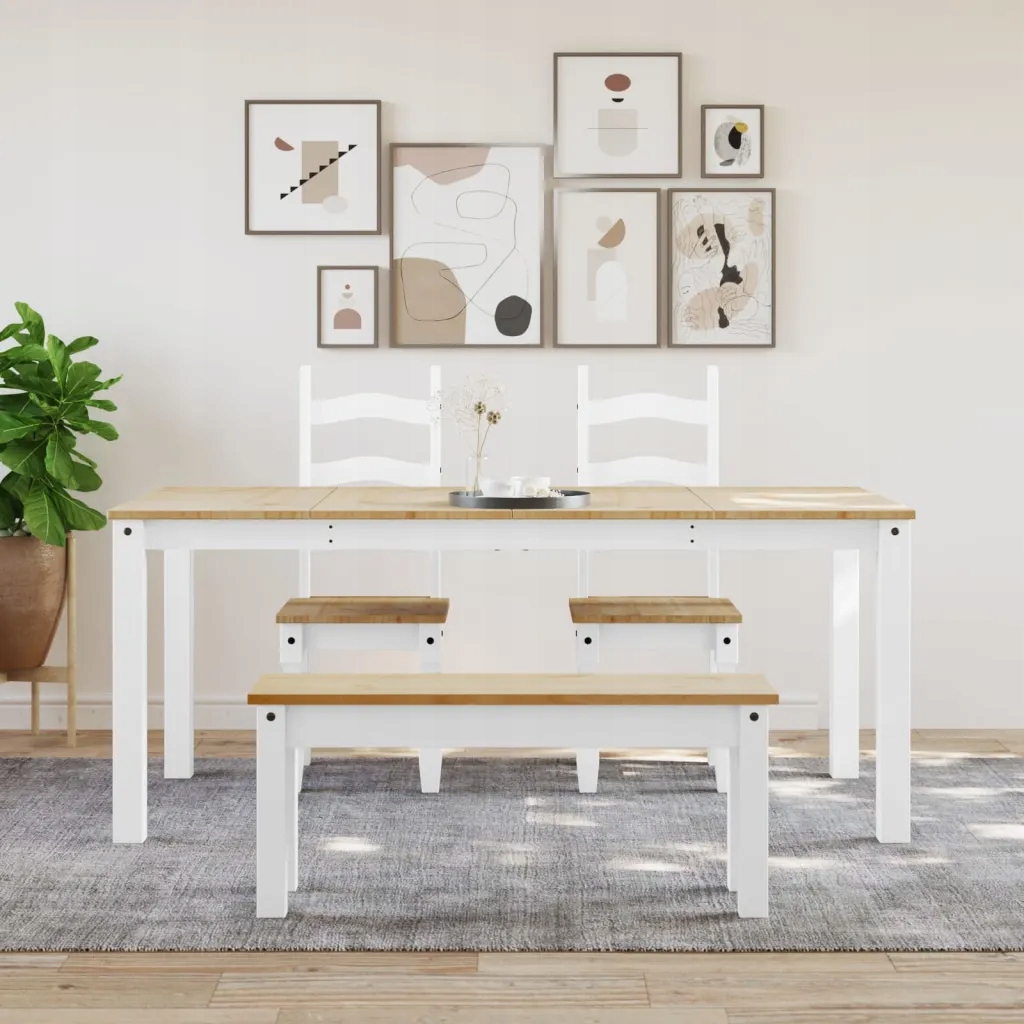 Wprowadź powiew minimalistycznego stylu i eleganckiego uroku do Twojej kuchni lub jadalni za pomocą naszego drewnianego stołu! Lite drewno sosnowe: stół jadalniany wykonano z litego drewna sosnowego. Drewno sosnowe to piękny, naturalny materiał. Ma prostą strukturę słojów, a sęki nadają mu wyjątkowy, rustykalny charakter.Praktyczny blat: solidny blat stołu jest idealnym miejscem na posiłki, napoje i przedmioty dekoracyjne.Łatwość czyszczenia: stół można łatwo wyczyścić wilgotną ściereczką. Maksymalnie 110 kg na siedzisko.