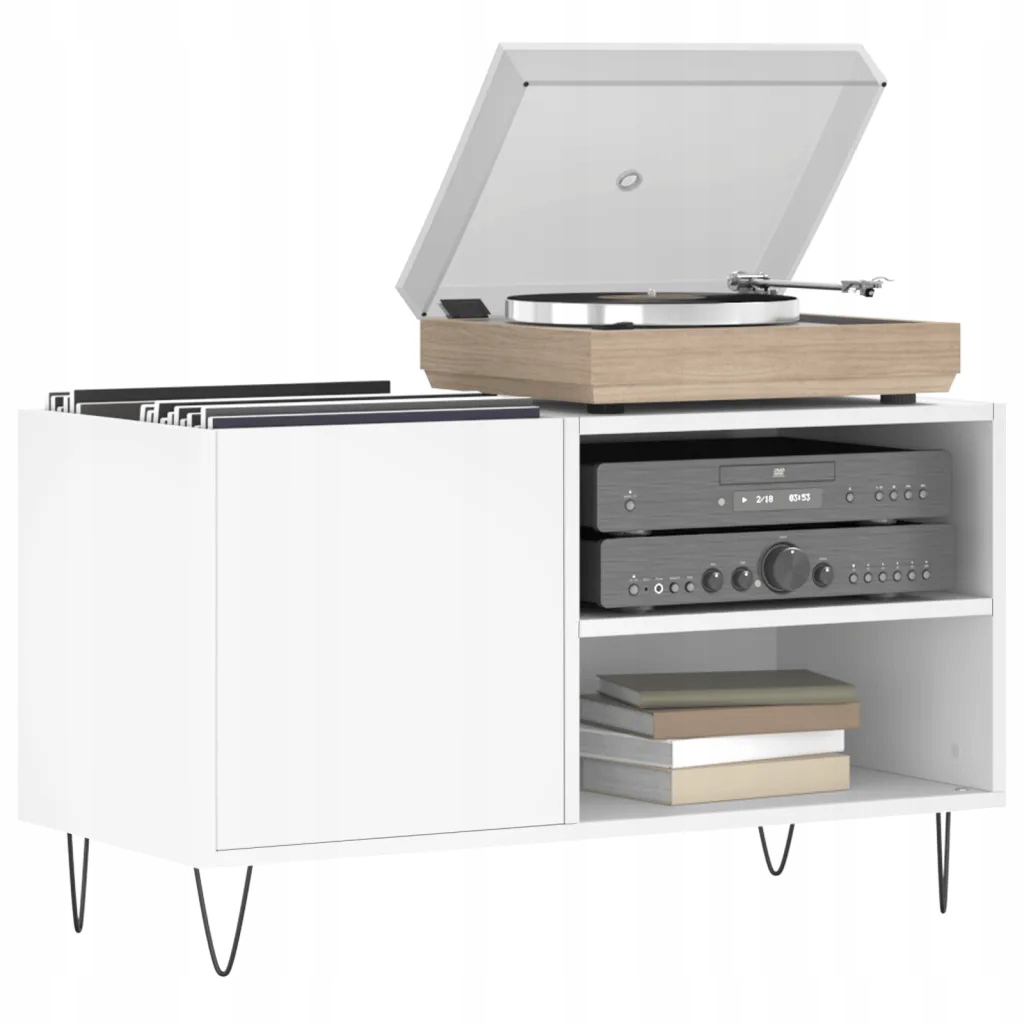 Uporządkuj i wyeksponuj swoje płyty winylowe za sprawą tej praktycznej, klasycznej szafki na płyty. Trwały materiał: materiał drewnopochodny charakteryzuje się wyjątkową jakością i gładką powierzchnią, a także wytrzymałością, stabilnością i odpornością na wilgoć.Dużo miejsca do przechowywania: przestronna szafka oferuje mnóstwo przestrzeni na nagrania i pozwala uporządkować swoją kolekcję płyt.Mocny blat: solidny blat szafki na płyty winylowe jest idealny do postawienia na nim odtwarzacza do płyt lub innych urządzeń elektronicznych.Żelazne nóżki: nóżki z żelaza dodają wnętrzu industrialnego stylu, zapewniając jednocześnie stabilność mebla.