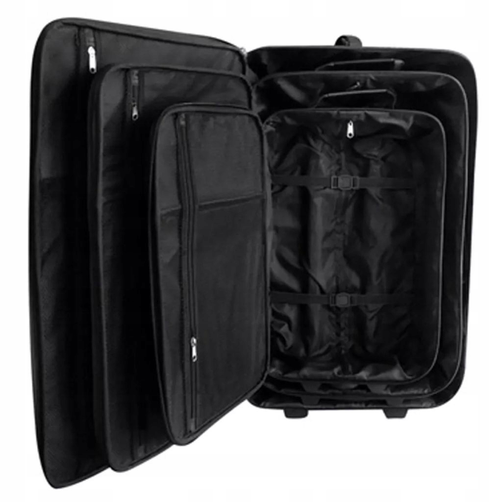 Dzięki temu zestawowi możesz z łatwością spakować cały swój bagaż. Różne rozmiary walizek umożliiwiają właściwy wybór na małą oraz dużą podróż. Wyciągane uchwyty teleskopowe oraz 2 kółka na spodzie sprawiają, że walizki są bardzo praktyczne w użyciu. Walizki wykonane są z tkaniny (100% poliester) z pokryciem PVC. Ich krawędzie są są dodatkowo obszyte, przez co bardziej odporne. Oprócz walizek w zestawie znajduje się również torba podróżna oraz kosmetyczka. Na czas przechowywania można złożyć walizki jedna w drugą, więc wystarczy, że znajdziesz miejsce do przechowywania największej z nich. Dzięki temu możesz zaoszczędzić mnóstwo miejsca! Ten 5-elementowy zestaw podróżny dostępny jest w kolorze czerwonym i czarnym.