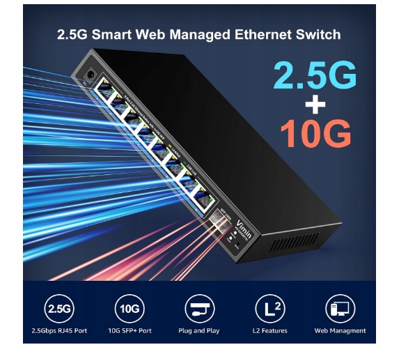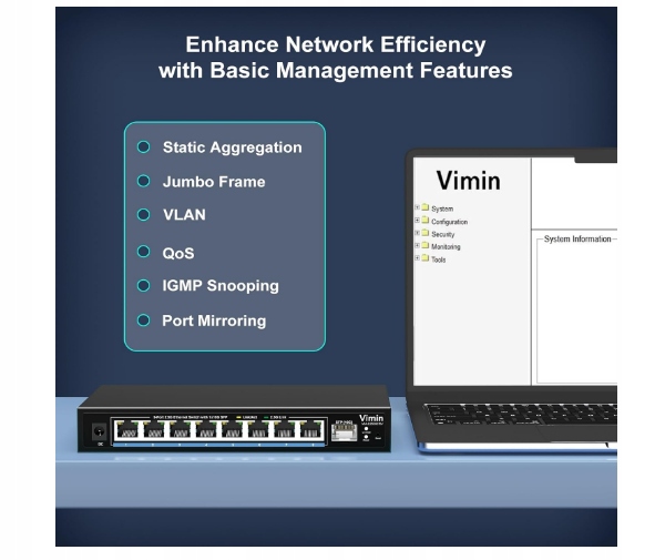 - 8 x 2,5 G port RJ45 i 1 x port SFP 10G: przełącznik zarządzania VIMIN 2,5G jest wyposażony w 8 adaptacyjnych portów RJ45 2,5G i 1 x port 10G SFP+ i oferuje elastyczny wybór opcji połączeń dla rozwijających się firm.