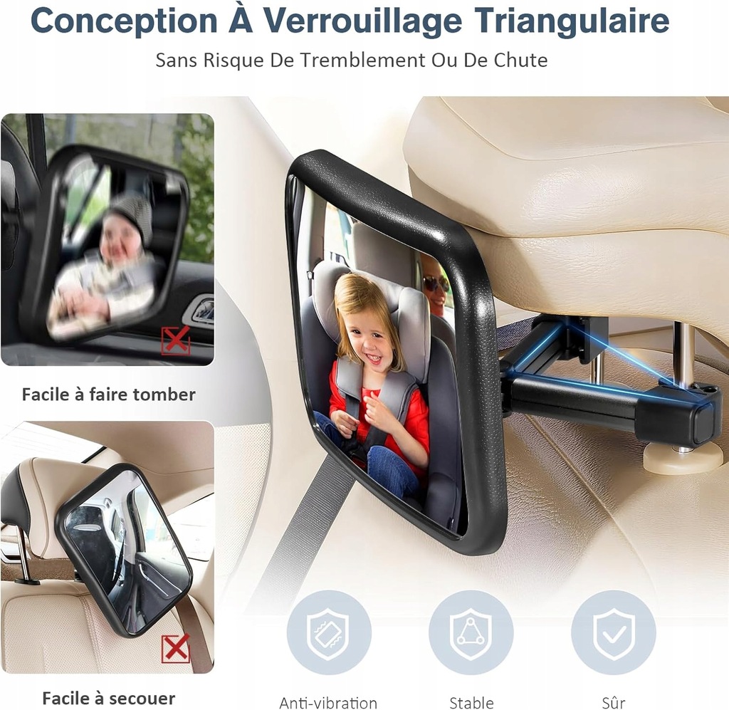 Jedyne w swoim rodzaju wzornictwo, stabilność: metalowa klamra lusterka dziecięcego może mocno trzymać tylne siedzenie, co rozwiązuje problem lepkich lub sznurkowych lusterek dla niemowląt, które nie są stabilne i łatwo spadają.