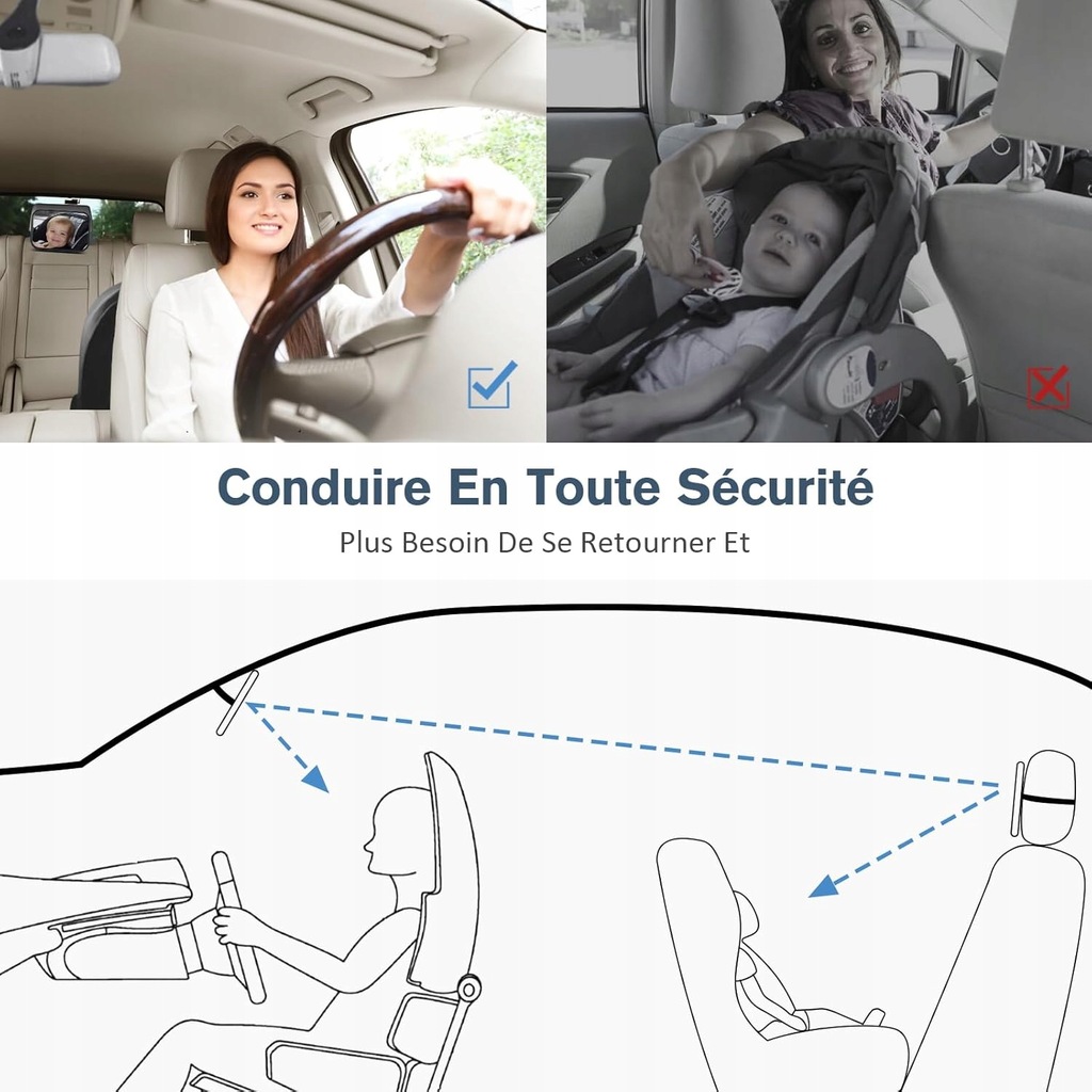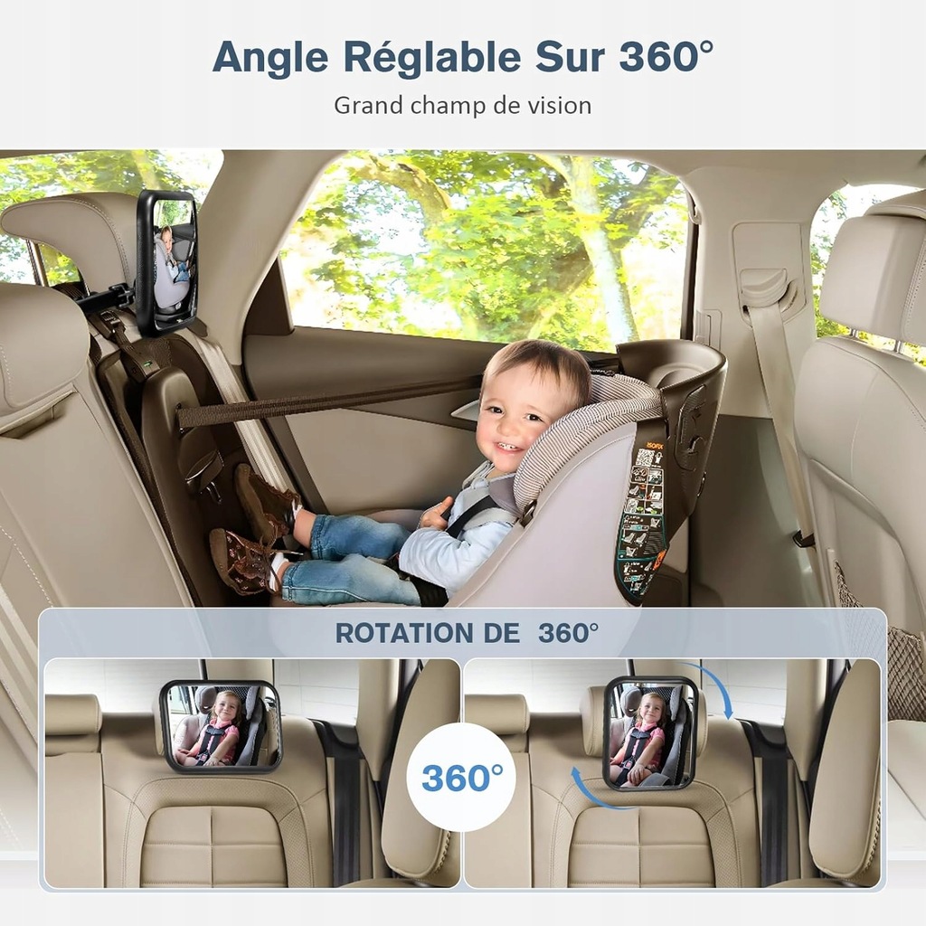 Szerokie pole widzenia, elastyczny obrót: klips do lusterka samochodowego jest wyposażony w kulkę obracającą się o 360°, która może regulować kąt lusterka dziecięcego w zależności od modelu samochodu i pozycji fotelika dziecięcego, dzięki czemu rodzice mogą widzieć dziecko zawsze i wszędzie. Lusterko samochodowe dla niemowląt ma większe pole widzenia i może odzwierciedlać obraz rodziców, dzięki czemu dzieci mogą łatwo zobaczyć mamę i tatę.