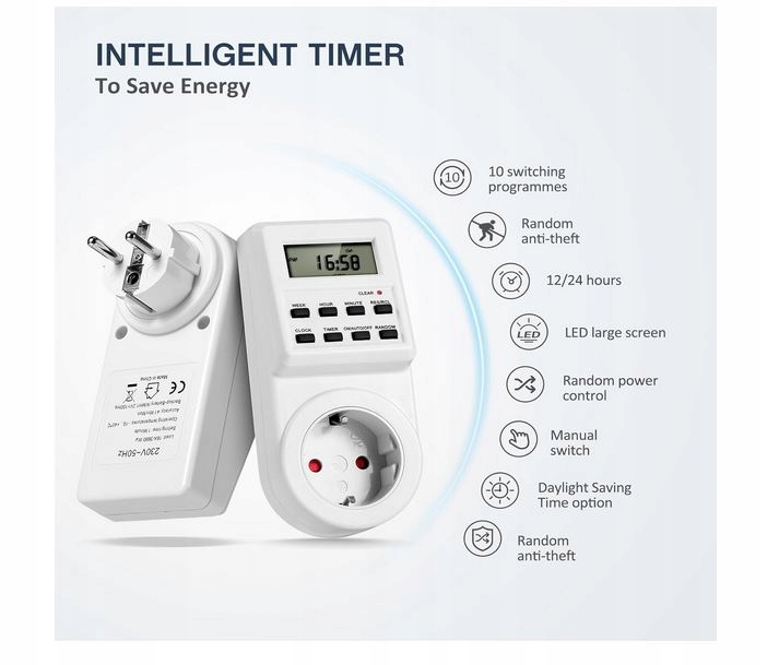 - Łatwość użytkowania: Duży wyświetlacz LED zapewniający lepszą widoczność i łatwą regulację. Naciśnij „Zegar”, a następnie „Timer”, aby ustawić do 10 programów włączania/wyłączania na tydzień. Naciśnij „Zegar i tydzień/godzinę/minutę”, aby ustawić kolejno czasy włączenia i wyłączenia.