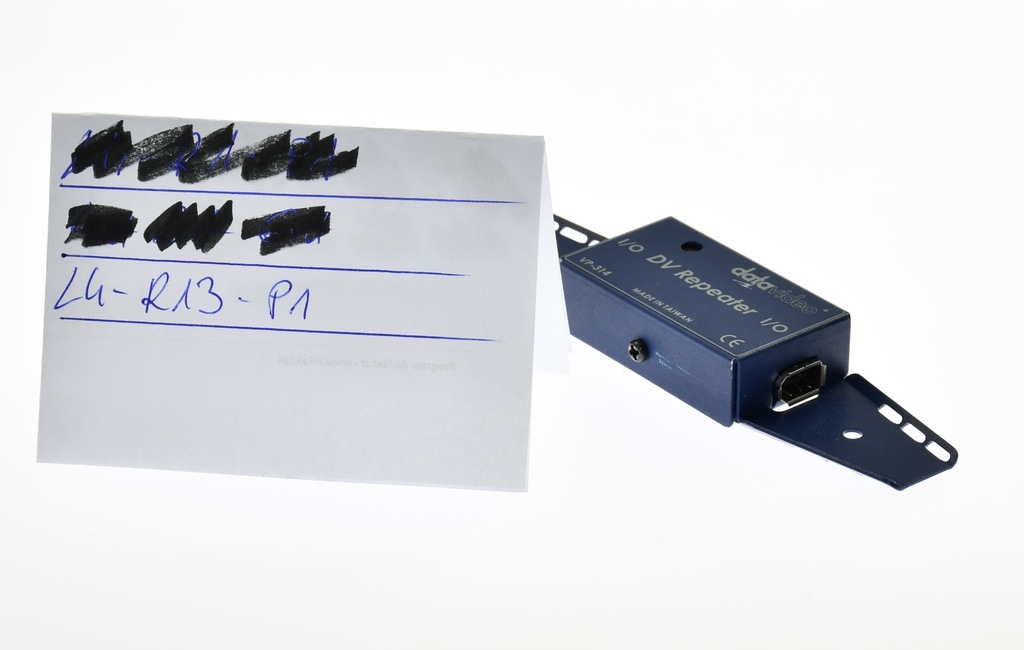 Używany, całkowicie sprawny element o symbolu: VP-314 firmy Datavideo. Wzmacniacz sygnału DV In Line. Łączy dwa 6-pinowe kable DV, aby wydłużyć przebiegi kabli. Przebiegi kabli do 200 metrów można osiągnąć, stosując wiele wzmacniaczy bez utraty jakości. Wzmacniacz DV pobiera energię za pośrednictwem kabla DV, jedno urządzenie musi dostarczać energię za pośrednictwem swojej magistrali DV.