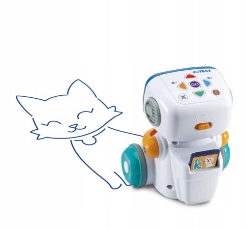 "Meet JotBot, your very own interactive robot drawing buddy by VTech! This adorable little robot loves to draw and encourages drawing through fun dialogue and storytelling! Insert 1 of 15 double-sided drawing data chips to watch JotBot draw the image on that chip. Code JotBot to draw using fun draw codes found within the included colour-coded guidebook, simply enter the directional codes onto the arrow keys on JotBot's head and away he goes! JotBot can draw on A3 and A4 paper, and also includes a child-friendly felt tip pen! JotBot can draw with most pens and pencils too! JotBot is full of personality, and will even sing as he draws! Recommended for children aged 3-5 years. Requires 4 x AA batteries (not included). New batteries recommended for regular use."