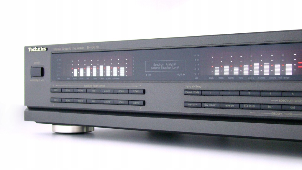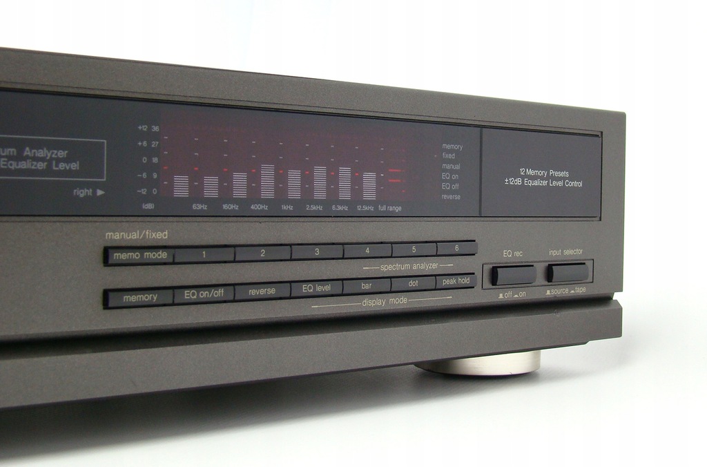 Posiada 4 rodzaje wyświetlania widma: EQ LEVEL - obecne ustawienia charakterystyki, BAR - tylko słupki, DOT - tylko wartości szczytowe w czasie rzeczywistym, PEAK HOLD - słupki oraz chwilowe wskazanie wartości szczytowych.