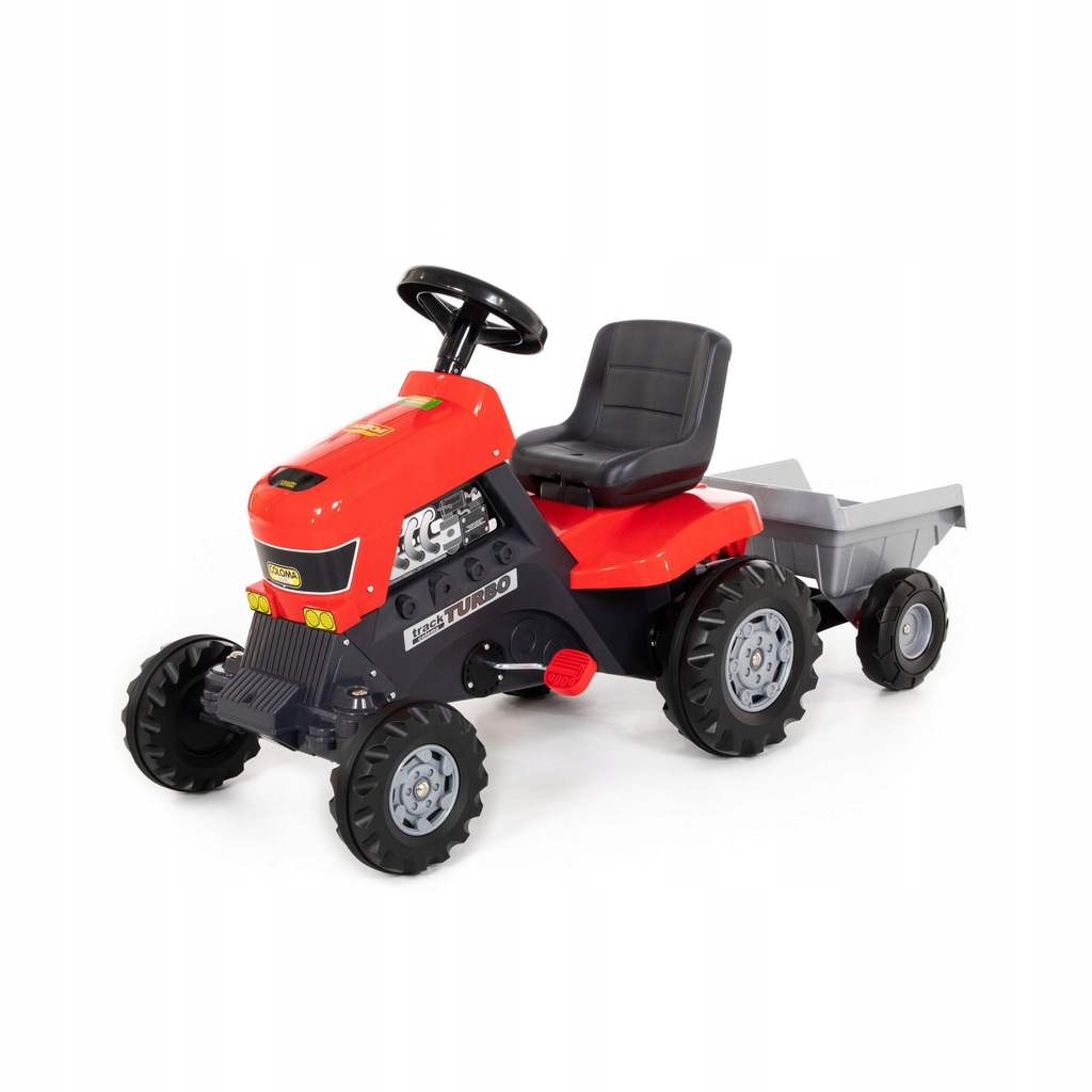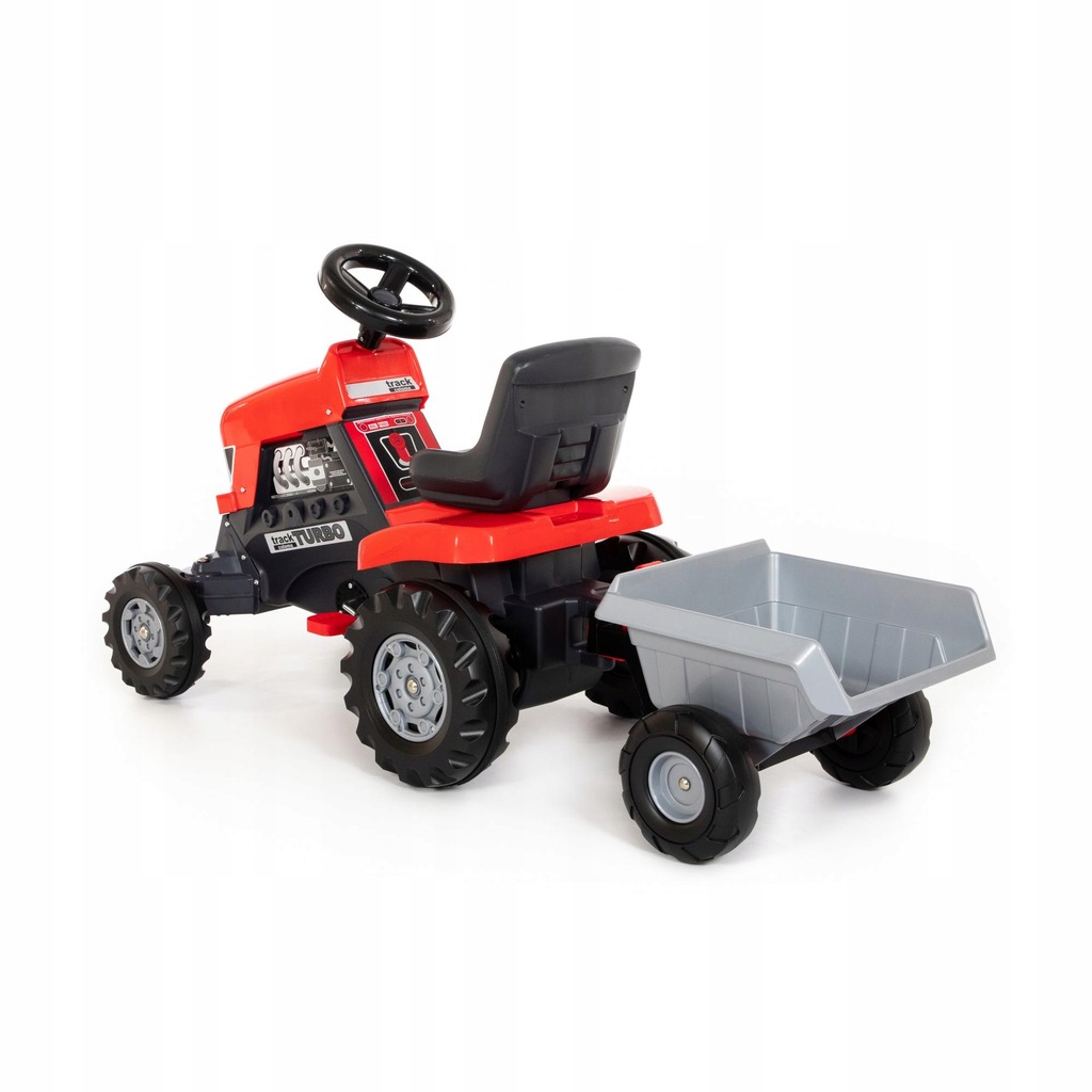 Traktor wyposażony jest w dwa pedały umożliwiające nadanie prędkości jeździkowi. Z przodu posiada dwa mniejsze, gumowe skrętne koła. Z tyłu z kolei dwa większe i szersze. Struktura bieżnika opon umożliwia podróżowanie pojazdem nawet na nierównej nawierzchni. Siedzenie jest szerokie i wygodne. Dodatkową atrakcję stanowi przyczepiana z tyłu traktora naczepa. W niej mały podróżnik będzie mógł transportować wszystko, co będzie mu w danym momencie niezbędne do dobrej zabawy.