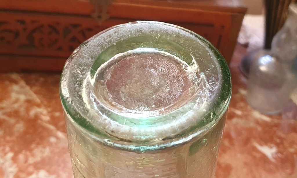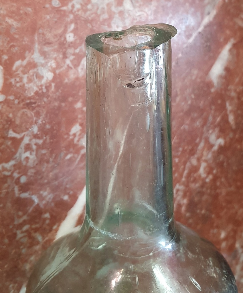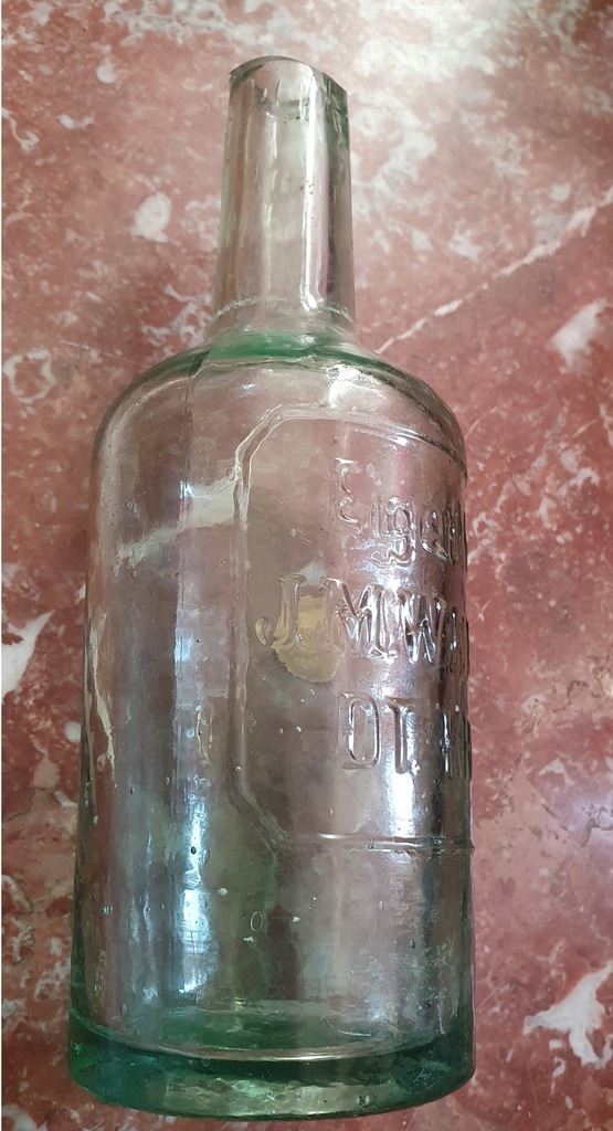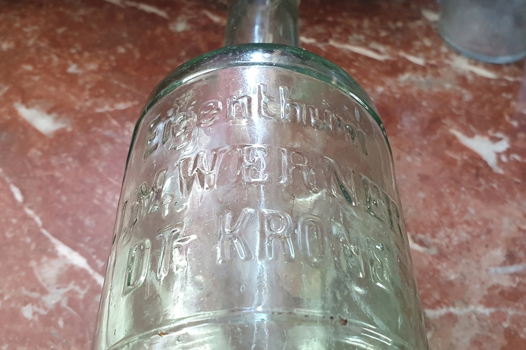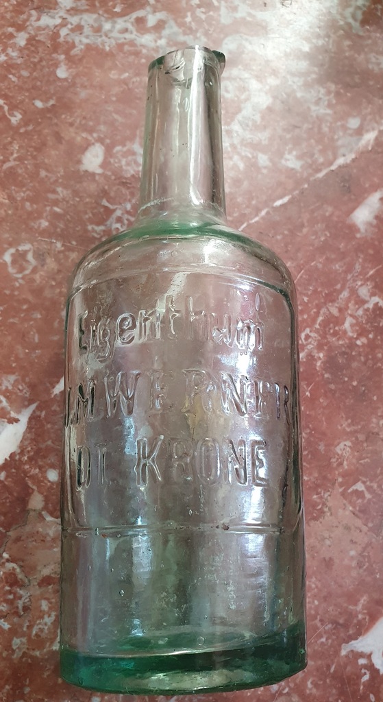 oferuję butelkę J.M. WERNER - Deutsch KRONE - rzadka butelka z Wałcza , białe lekko młotkowane szło, bąbelki, niestety utrącona końcówka szyjki , poj. 0.33L.
