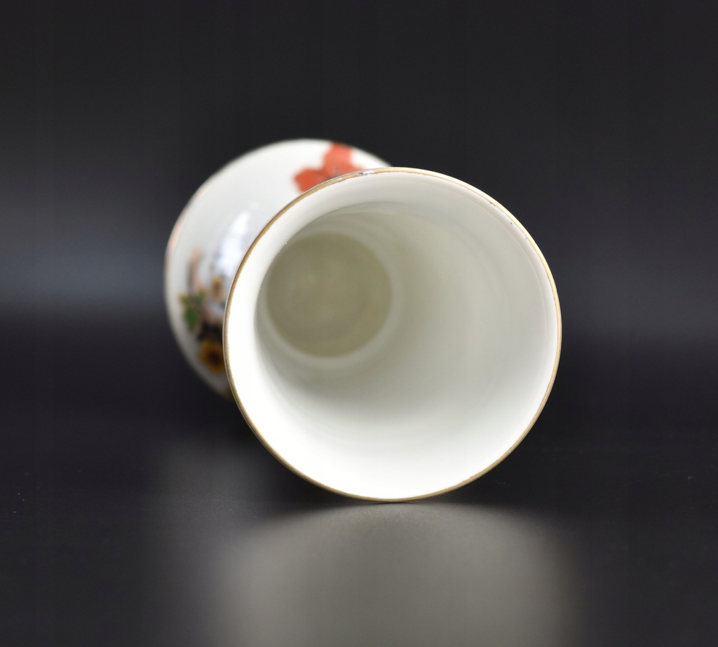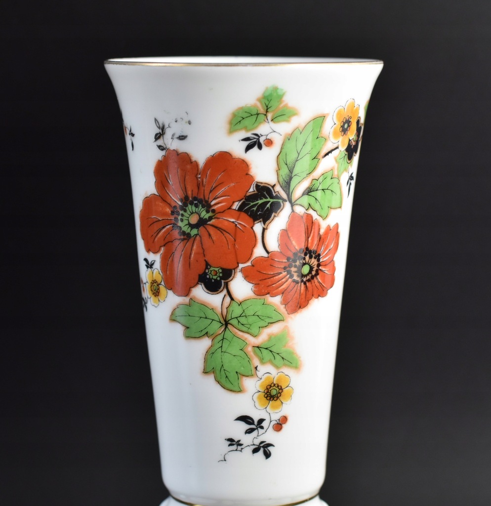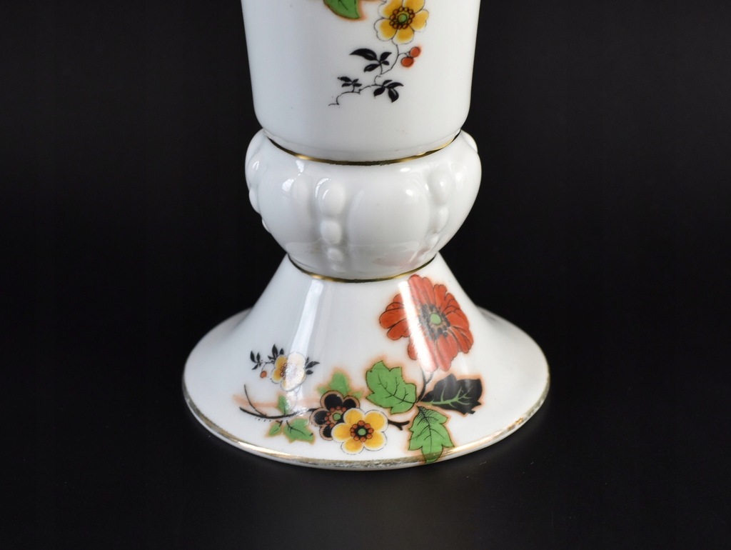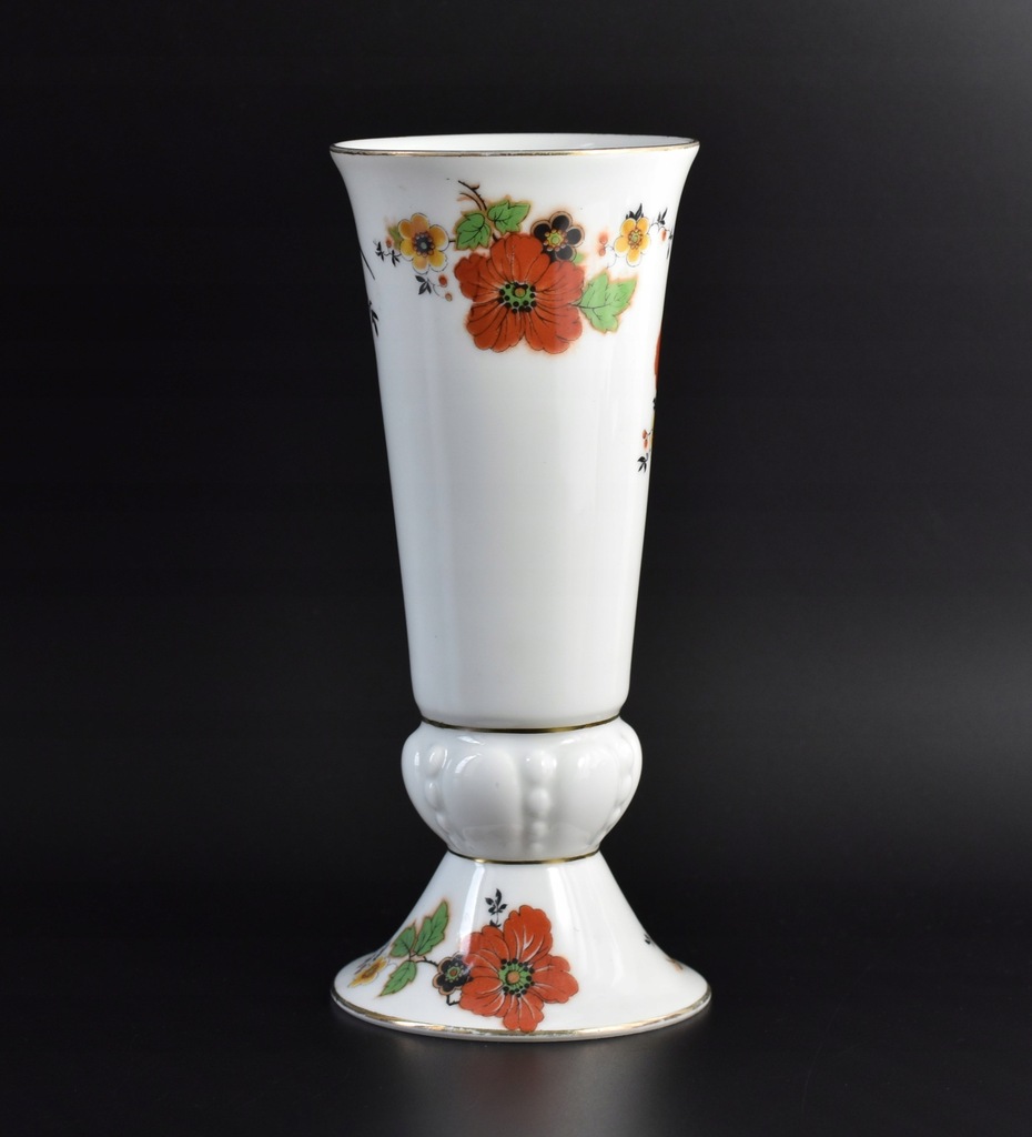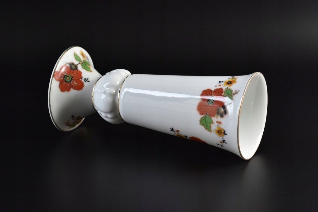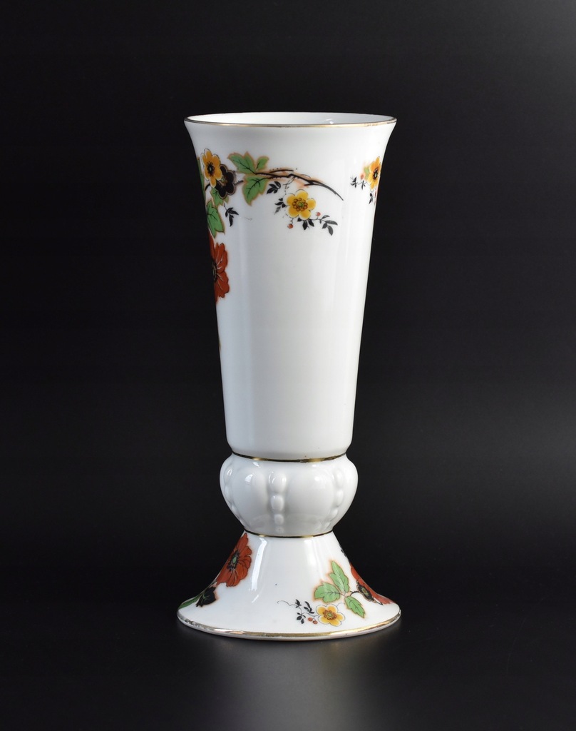 Wazon w stylu art deco ze śląskiej manufaktury Rheinholda Schlegelmilcha. BIała porcelana zdobiona kwiatowym dekorem. Ciekawa forma osadzona na nóżce z ozdobnym, reliefowanym elementem łączącym podstawę z korpusem.