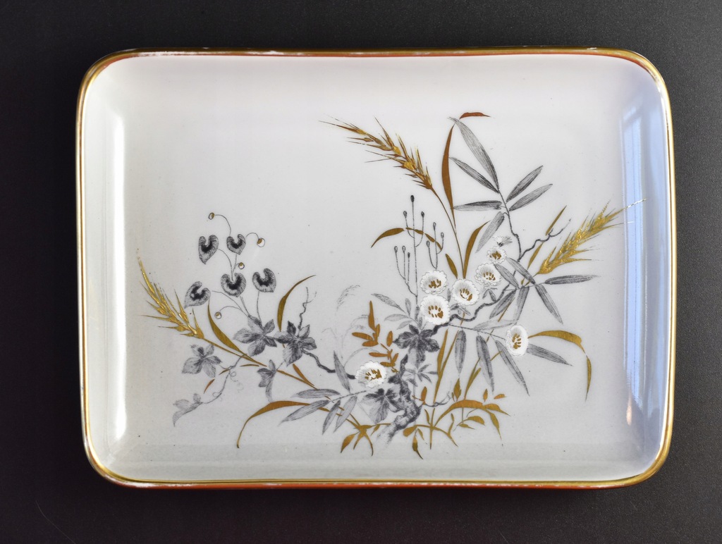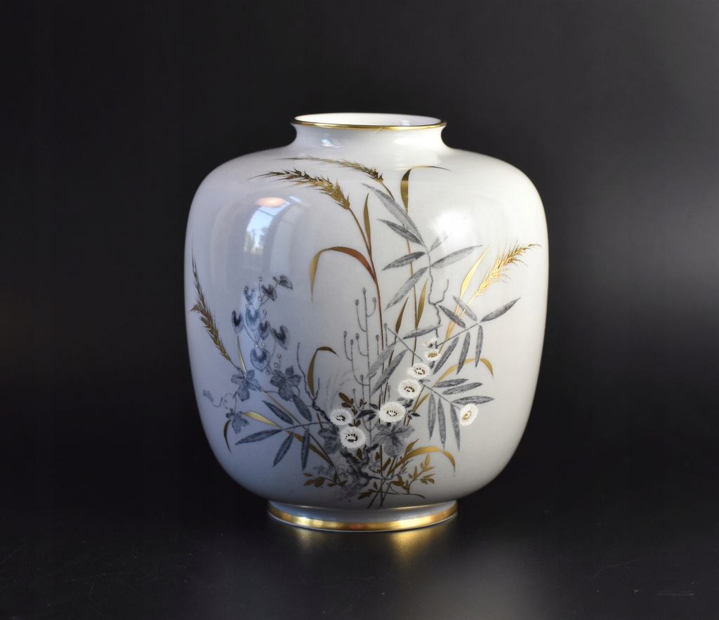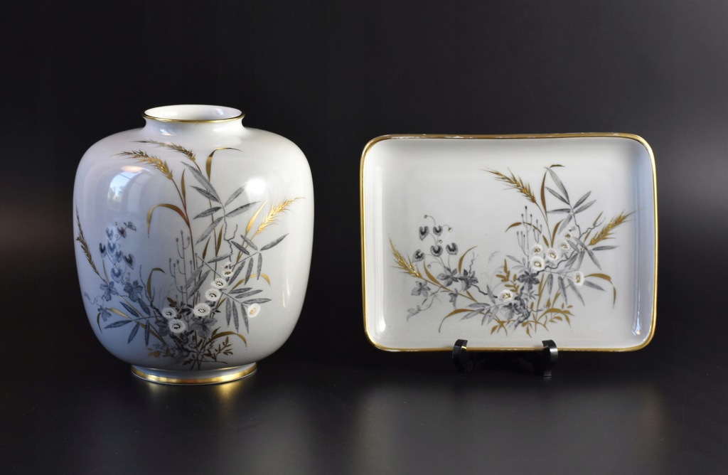 Eleganckie i stonowane połączenie złota z różnymi odcieniami szarości oraz bieli. Wyjątkowy roślinny dekor, w całości ręcznie malowany.