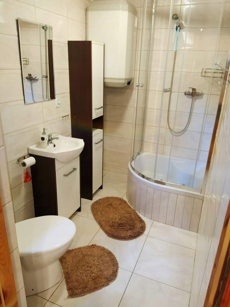 • łazienka z umywalką, toaletą, prysznicem, lustrem i szafką łazienkową