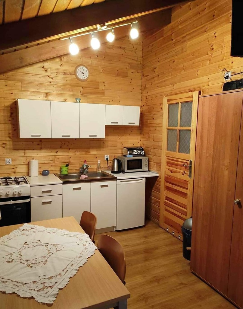 • aneks kuchenny z bieżącą wodą zimną i ciepłą, lodówką z zamrażalnikiem, kuchenką gazowo-elektryczną, czajnikiem bezprzewodowym, kuchenką mikrofalową, kompletem sztućców, garnków, talerzy, szklanek itp.