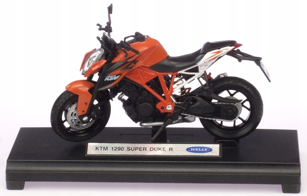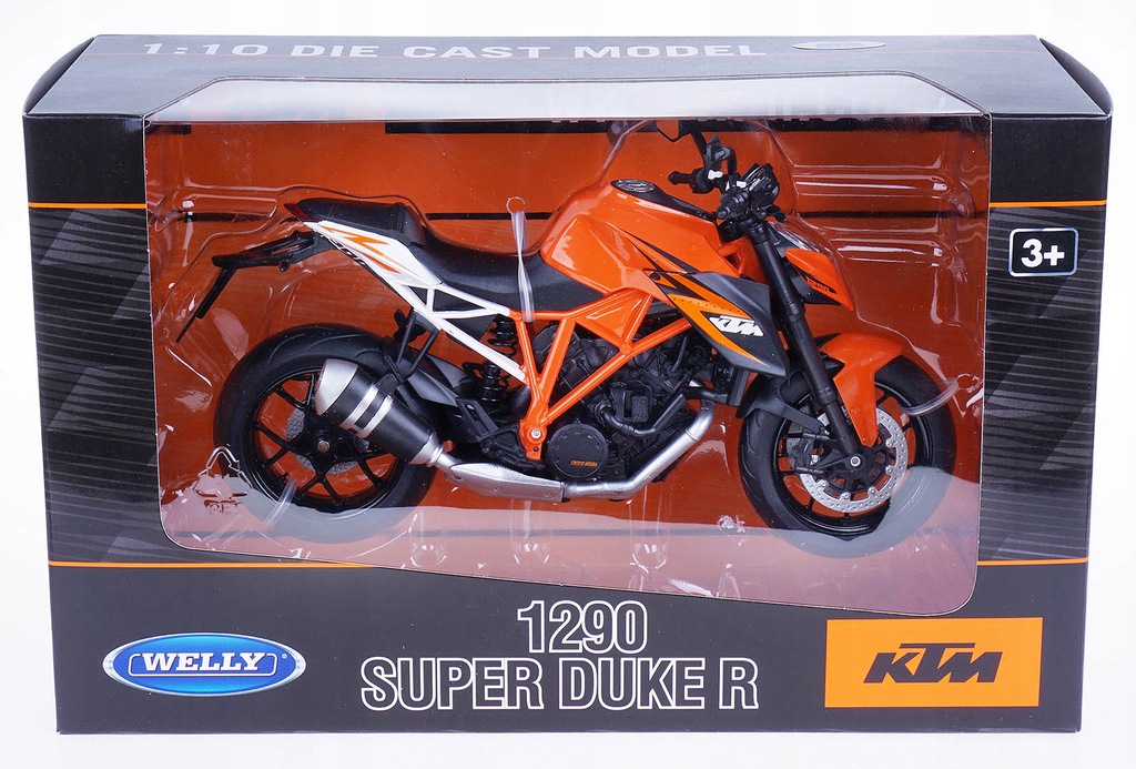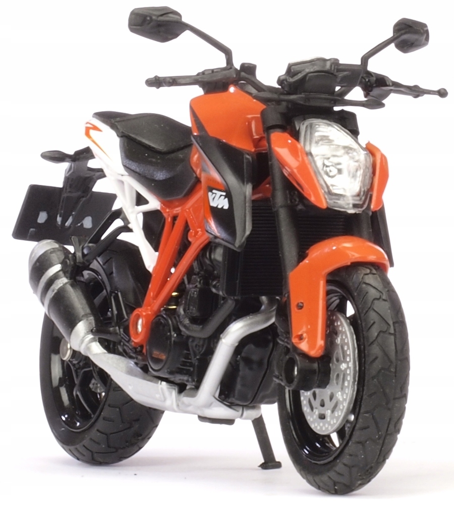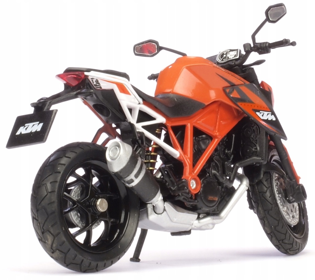 Model motocykla KTM 1290 SUPER. Został odwzorowany bardzo realistycznie i z dbałością o detale. W projekcie nie pominięto np. elementów silnika, tarcz hamulcowych i odblaskowych lusterek. Model został wzbogacony o element odwzorowujący wlew baku. Zabawka posiada ruchomą kierownicę. Dzięki temu możliwe jest sterowanie modelem za pomocą palców. Napisy znajdujące się na karoserii są dokładnie takie jak w przypadku oryginalnej maszyny. Opony posiadają wyraźnie oznaczony bieżnik. Produkt został zapakowany w pudełko z okienkiem.