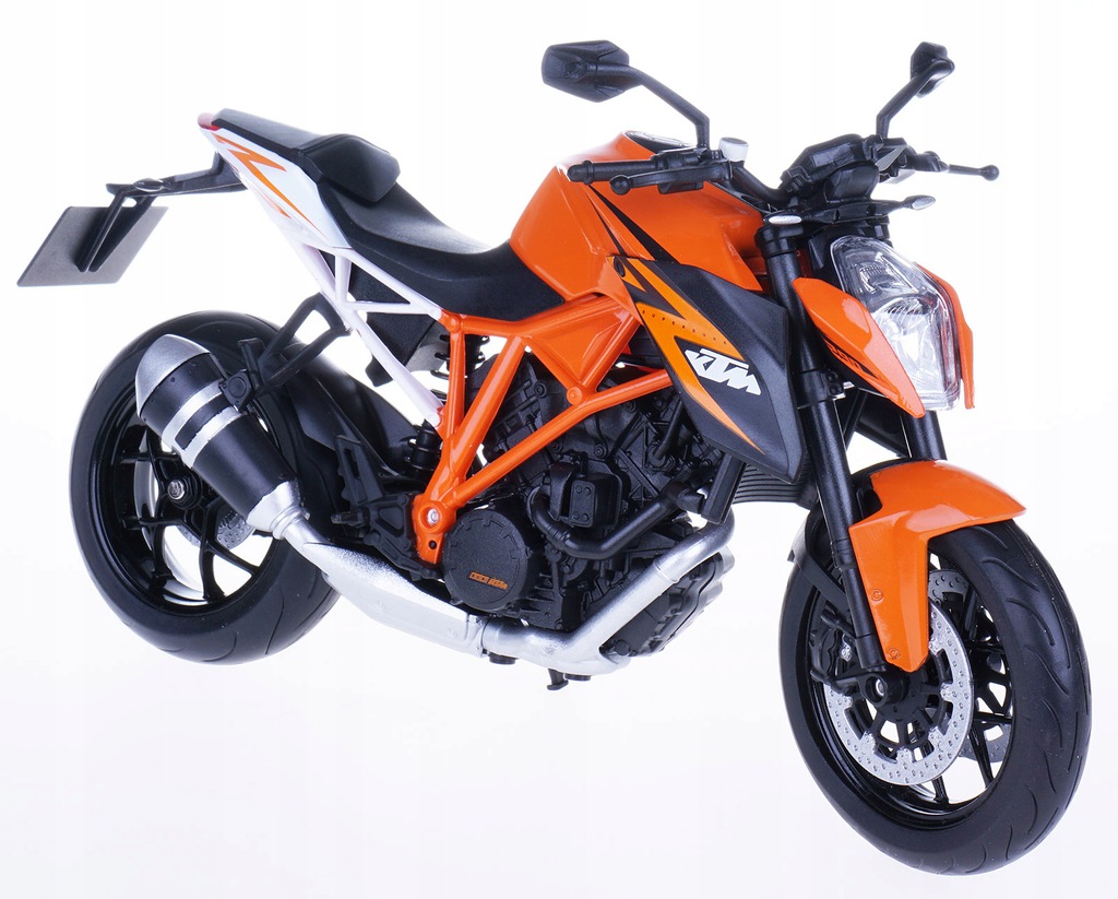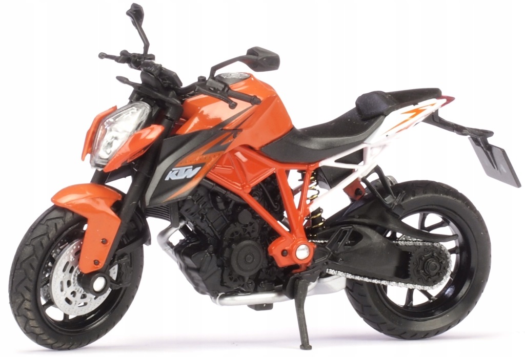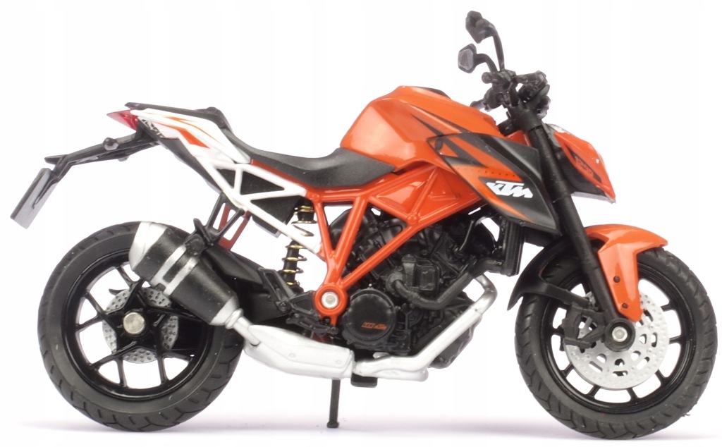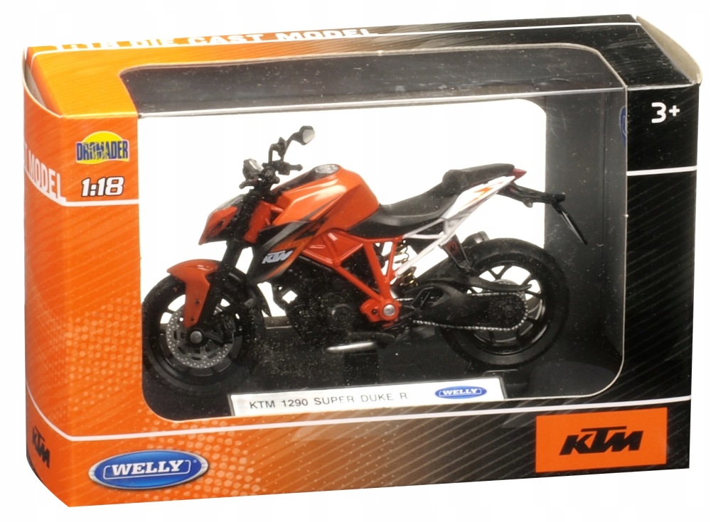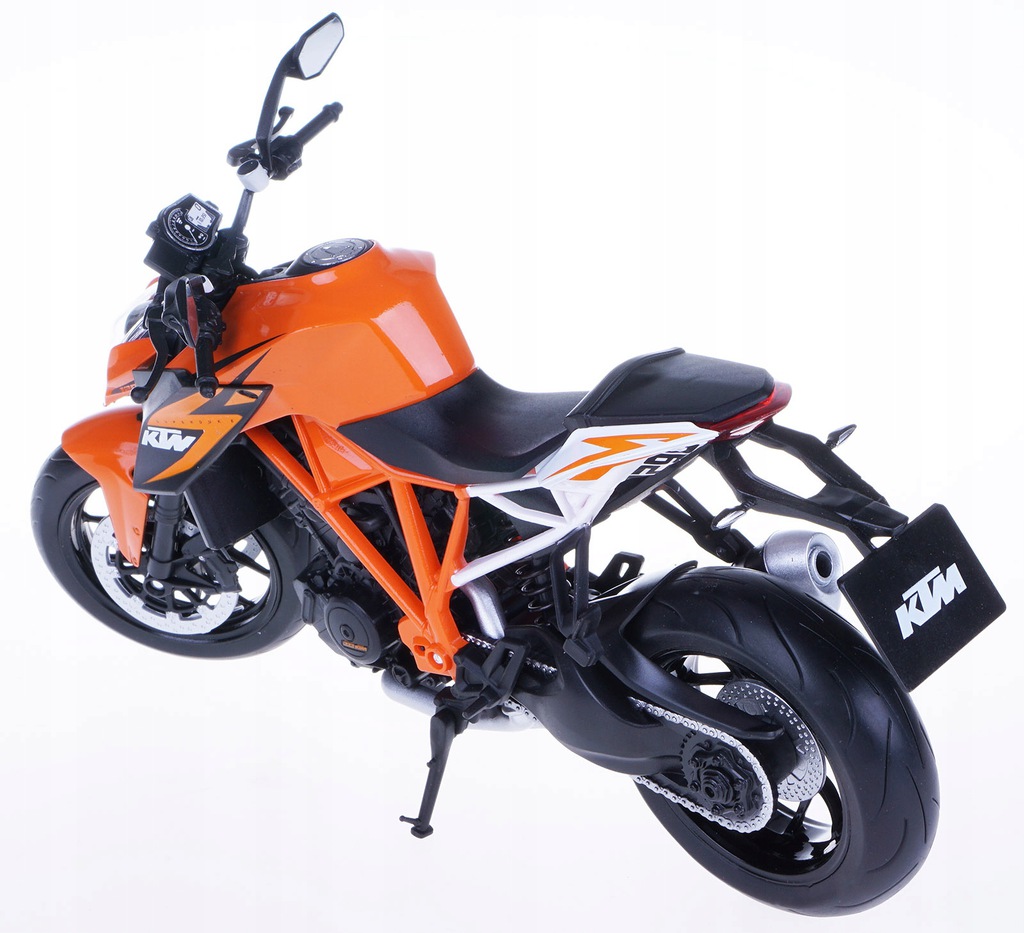 Model motocykla KTM 1290 SUPER. Został odwzorowany bardzo realistycznie i z dbałością o detale. W projekcie nie pominięto np. elementów silnika, tarcz hamulcowych i odblaskowych lusterek. Model został wzbogacony o element odwzorowujący wlew baku. Zabawka posiada ruchomą kierownicę. Dzięki temu możliwe jest sterowanie modelem za pomocą palców. Napisy znajdujące się na karoserii są dokładnie takie jak w przypadku oryginalnej maszyny. Opony posiadają wyraźnie oznaczony bieżnik. Produkt został zapakowany w pudełko z okienkiem.