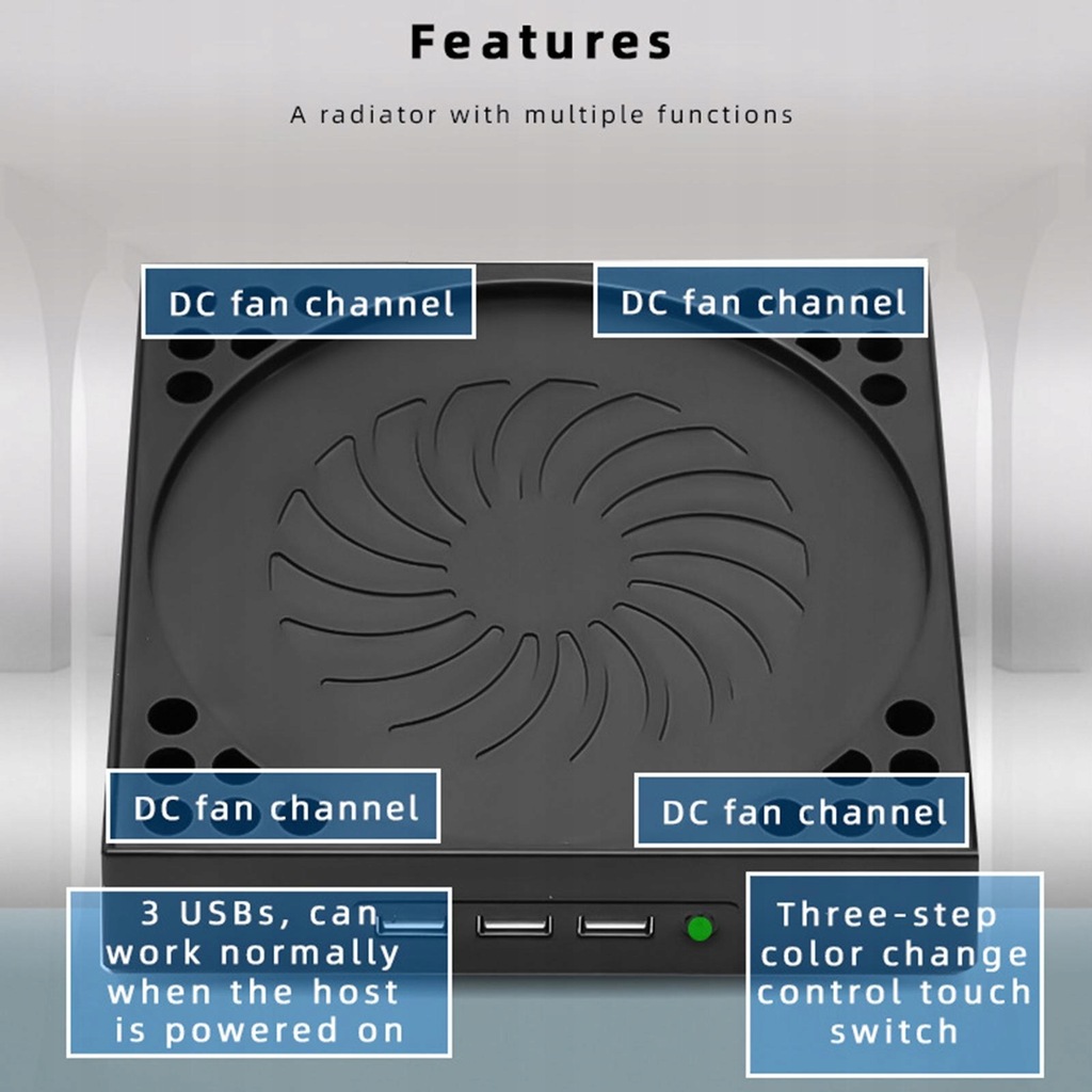 Vertical air ccurrent, fits the air current channels at the four corners of the bottom of the host, and cool from bottom to top.